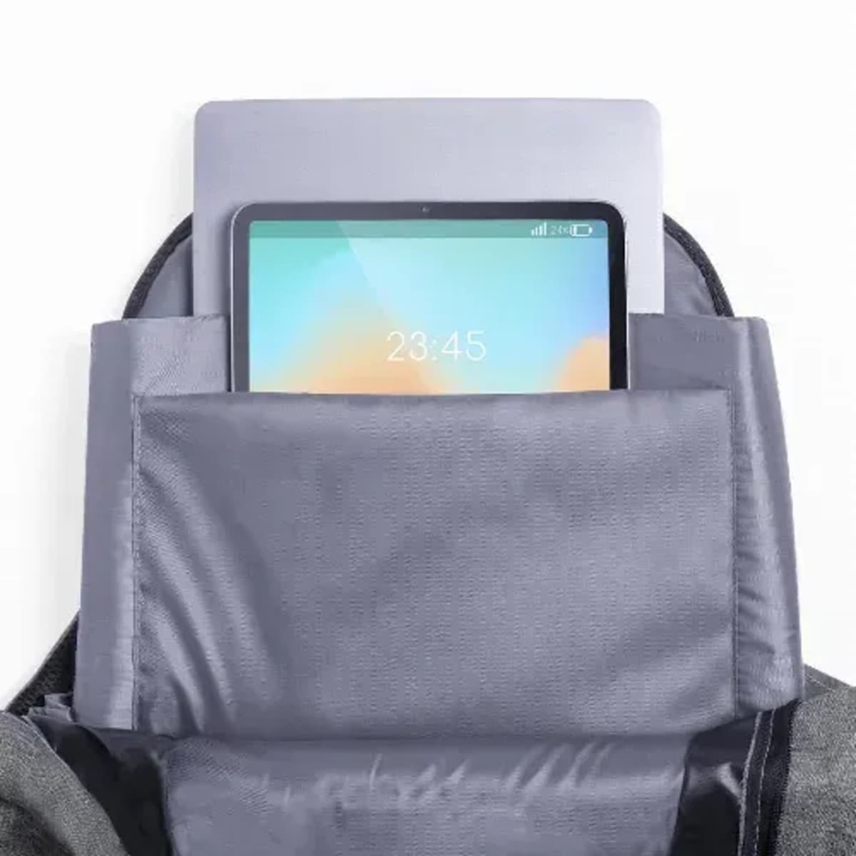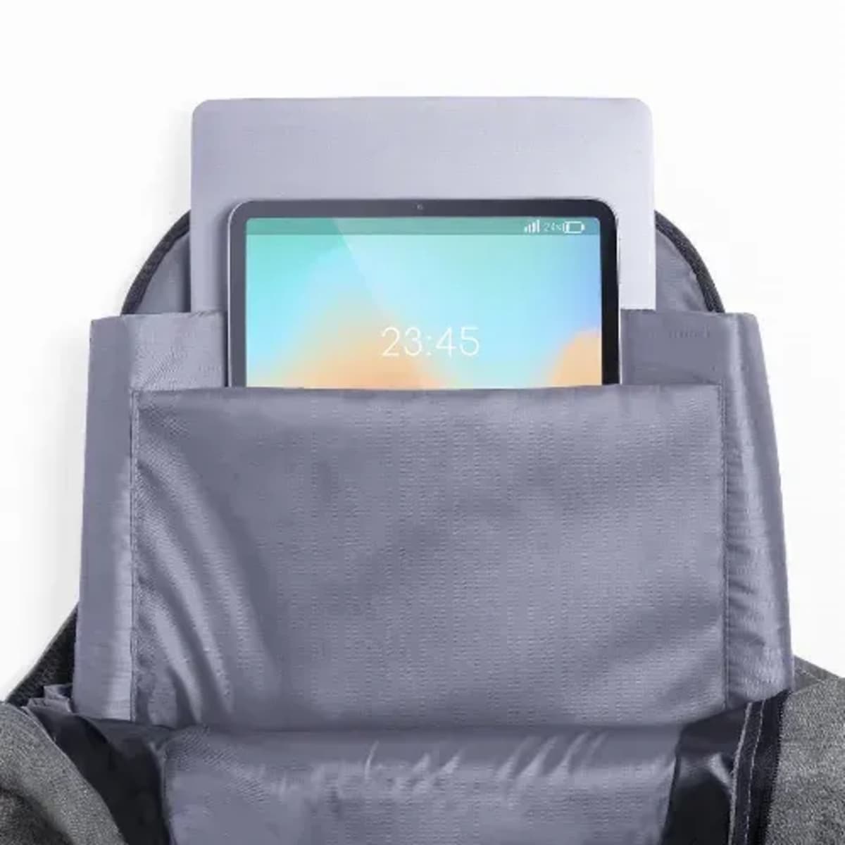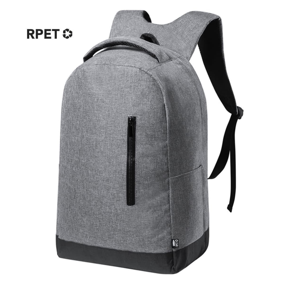 Includes anti-theft pocket for storing valuables. Zippered outer pocket with two padded inner compartments for laptops up to 15 inches and tablets up to 12 inches. Shoulder and back straps with ergonomic padding and distinctive RPET on the outside la