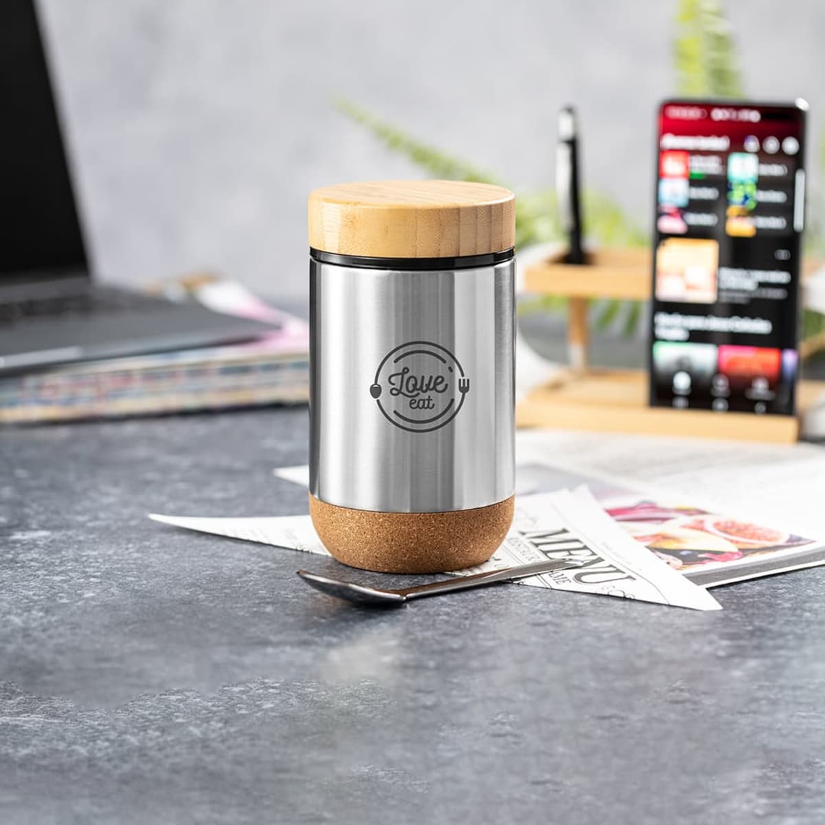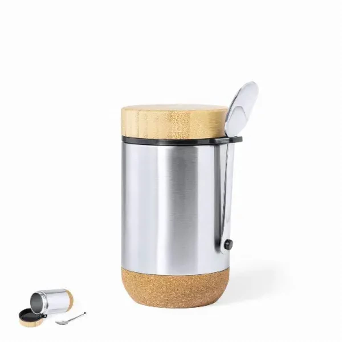 Double wall stainless steel body, with cork base to maintain the temperature and safety cap in bamboo, including attachment accessory for the stainless steel spoon (included). Presented in an individual box of eco design in kraft cardboard.