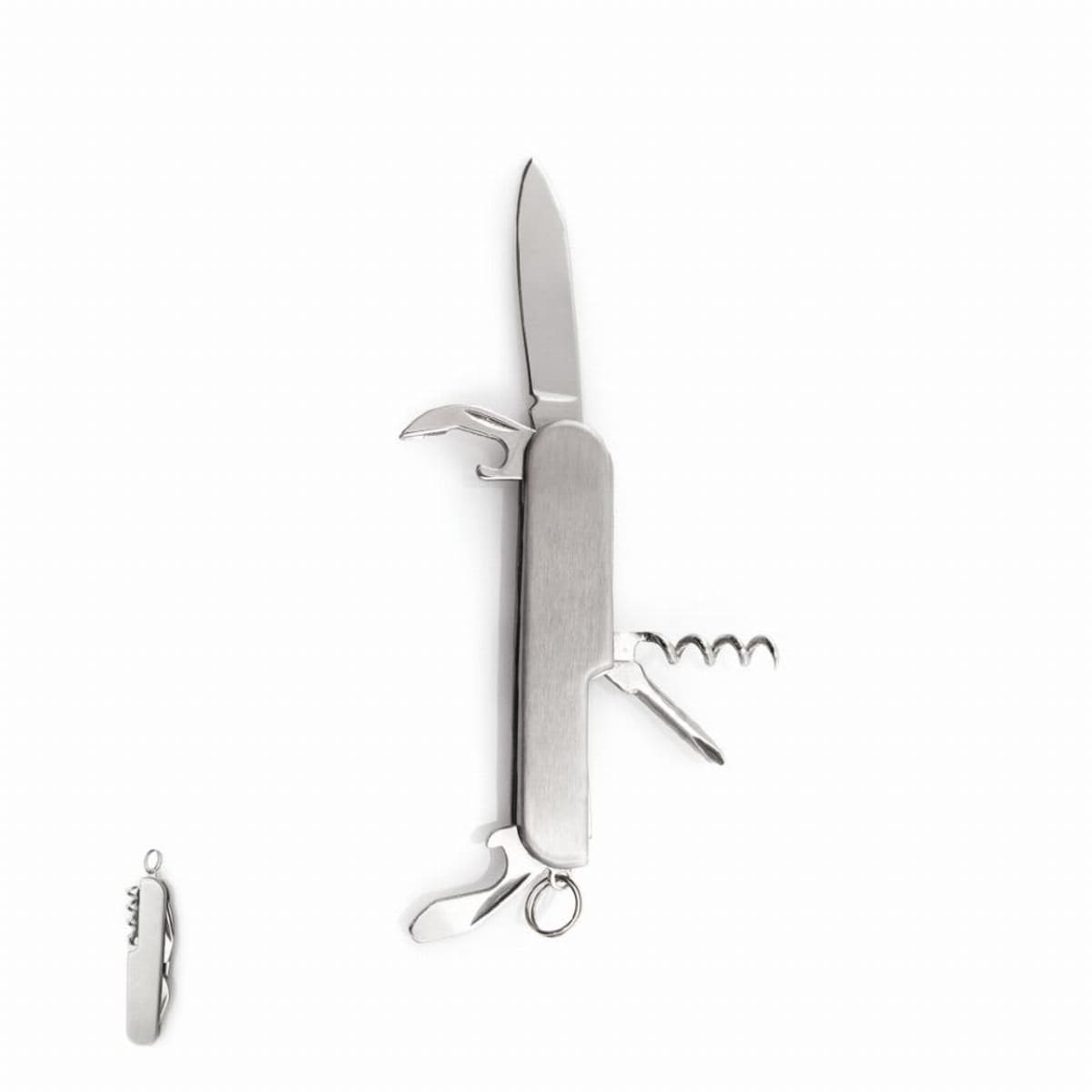 Includes knife, openers, screwdriver and keychain. Presented in an individual box.