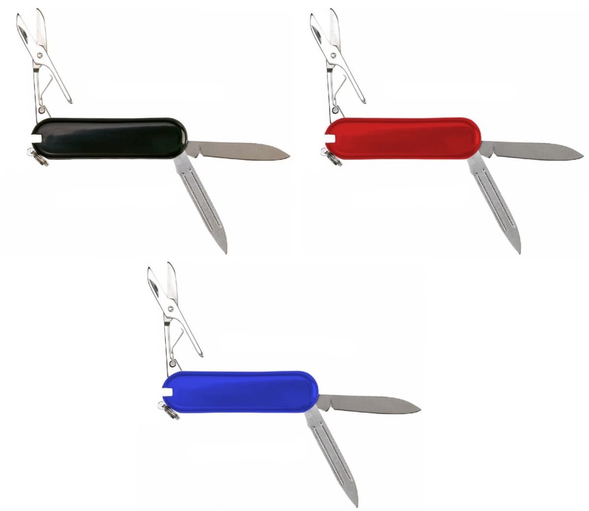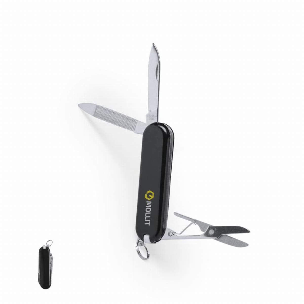 Multi purpose mini-knife with stainless steel accessories, 6 functions in varied colors.