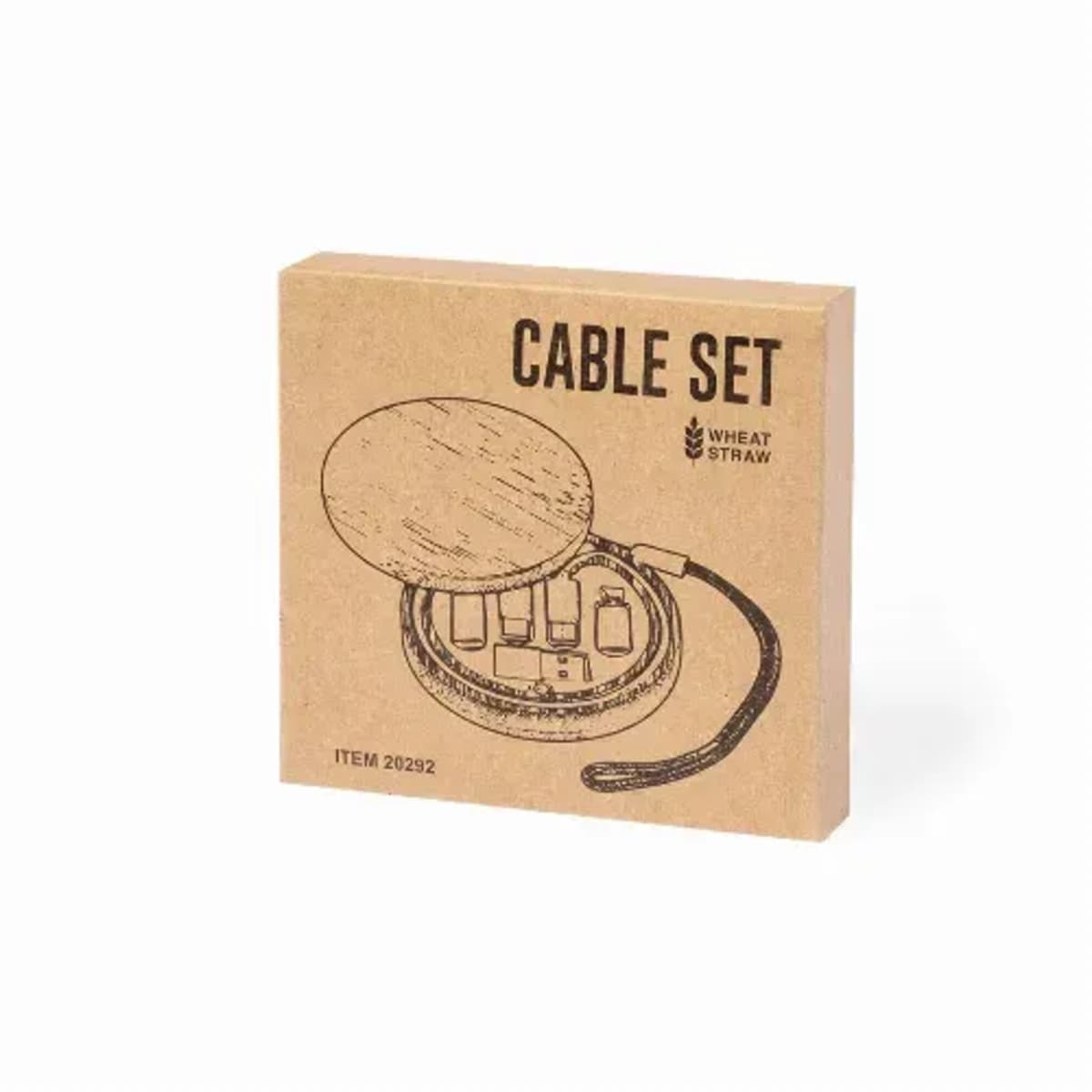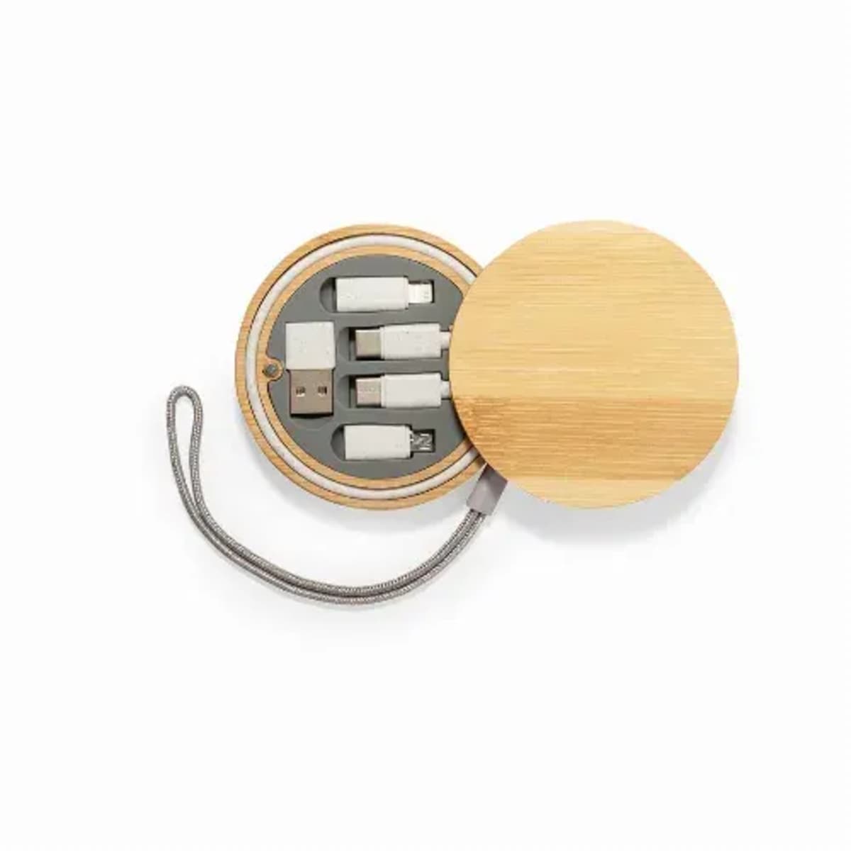 Including cable with data transfer capability and multiple connections, with Micro USB, Type C and Lightning heads. 5V DC 3A.Presented in a kraft design box.Made with vegetable elements to promote the use of natural raw materials and reduce polluting
