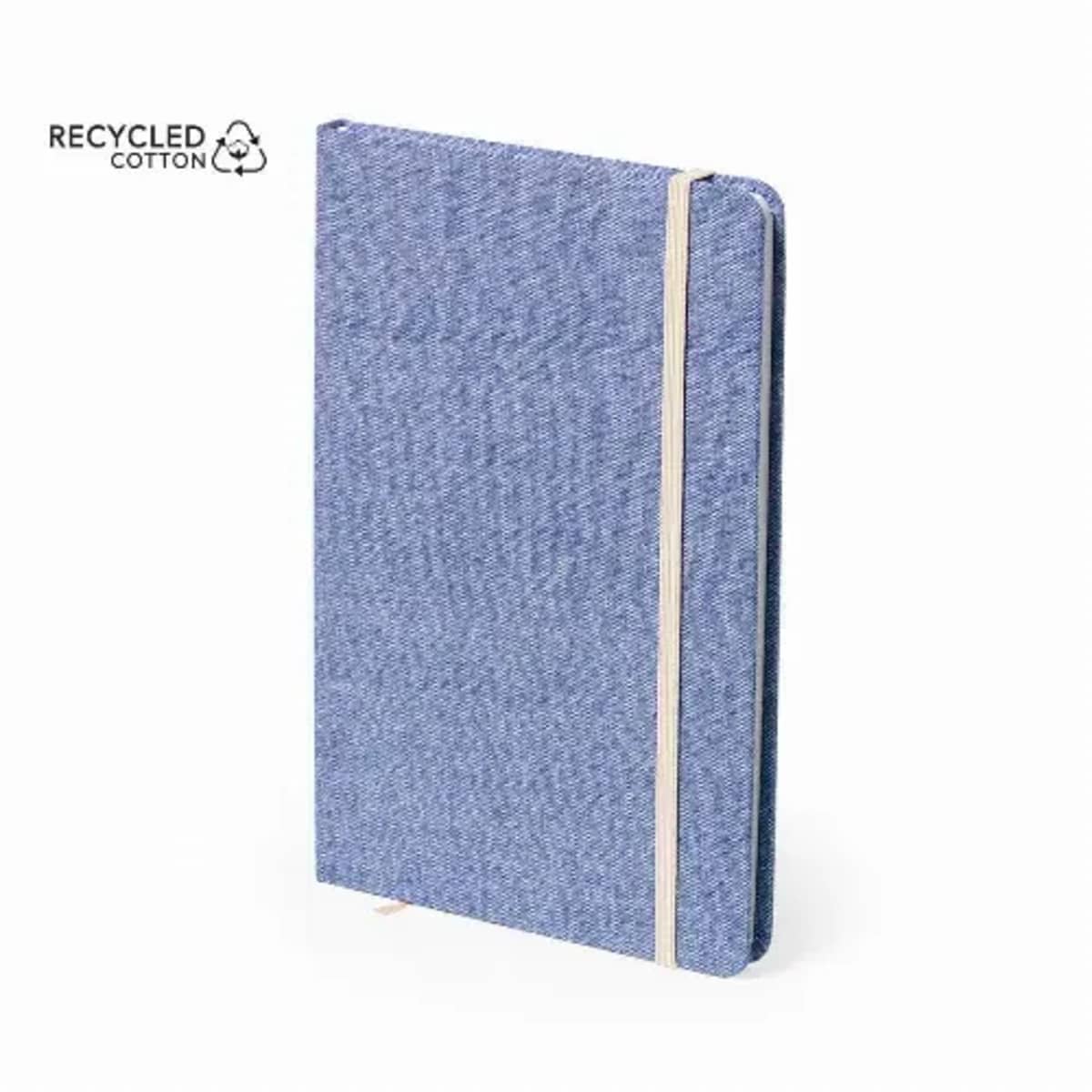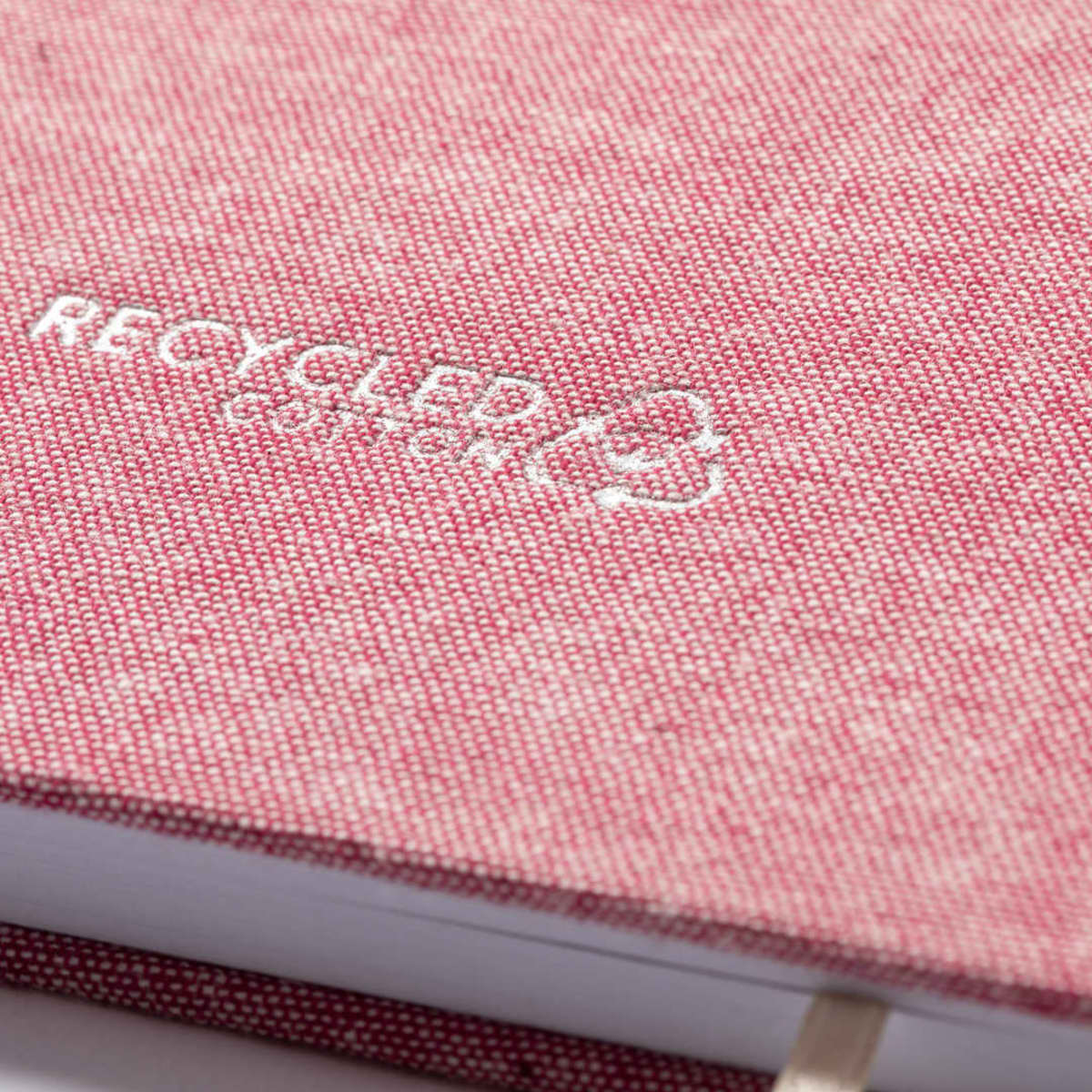 With hard covers and elastic band in contrasting colour. Inside with 100 plain sheets and fabric bookmark. Available in a wide range of colours, with recycled cotton logo on the back cover. GRS (Global Recycled Standard) certification available, g