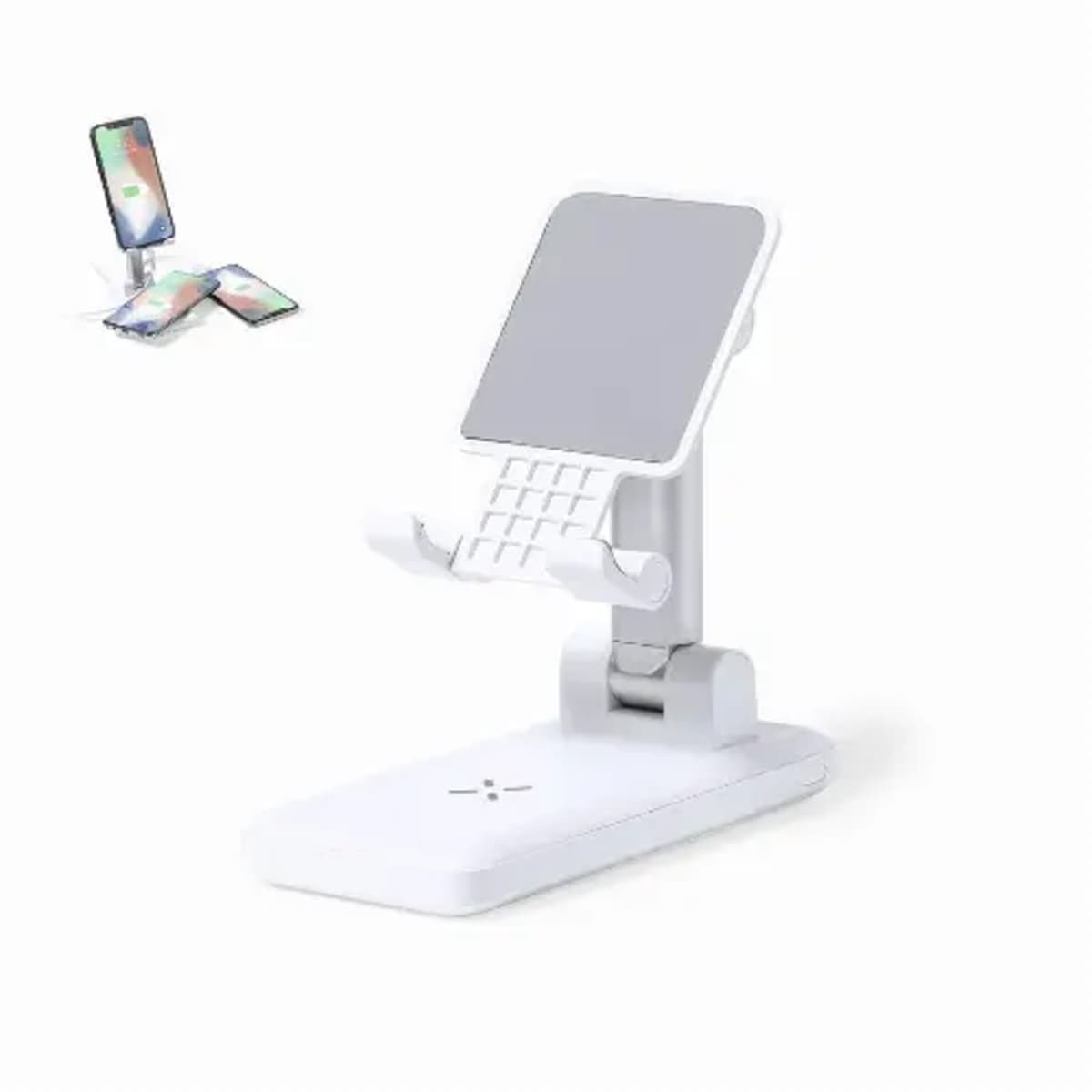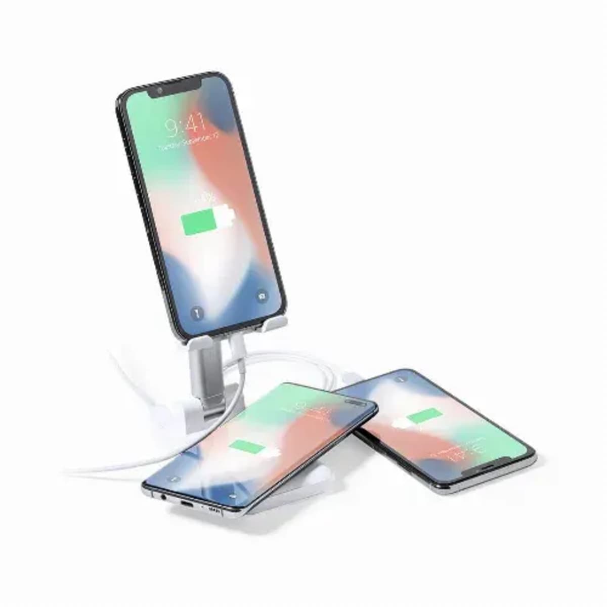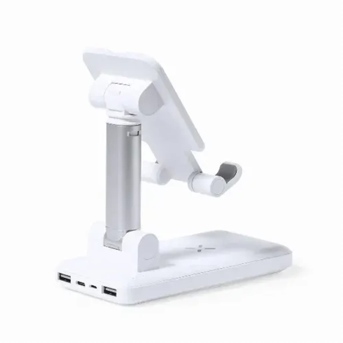 Adjustable in height and angle for an optimal view of the smartphone screen. Integrated 10W wireless charger and 5,000 mAh battery, with Type-C input/output, micro USB input and two USB outputs. Compatible with wireless charging mobile devices, inclu