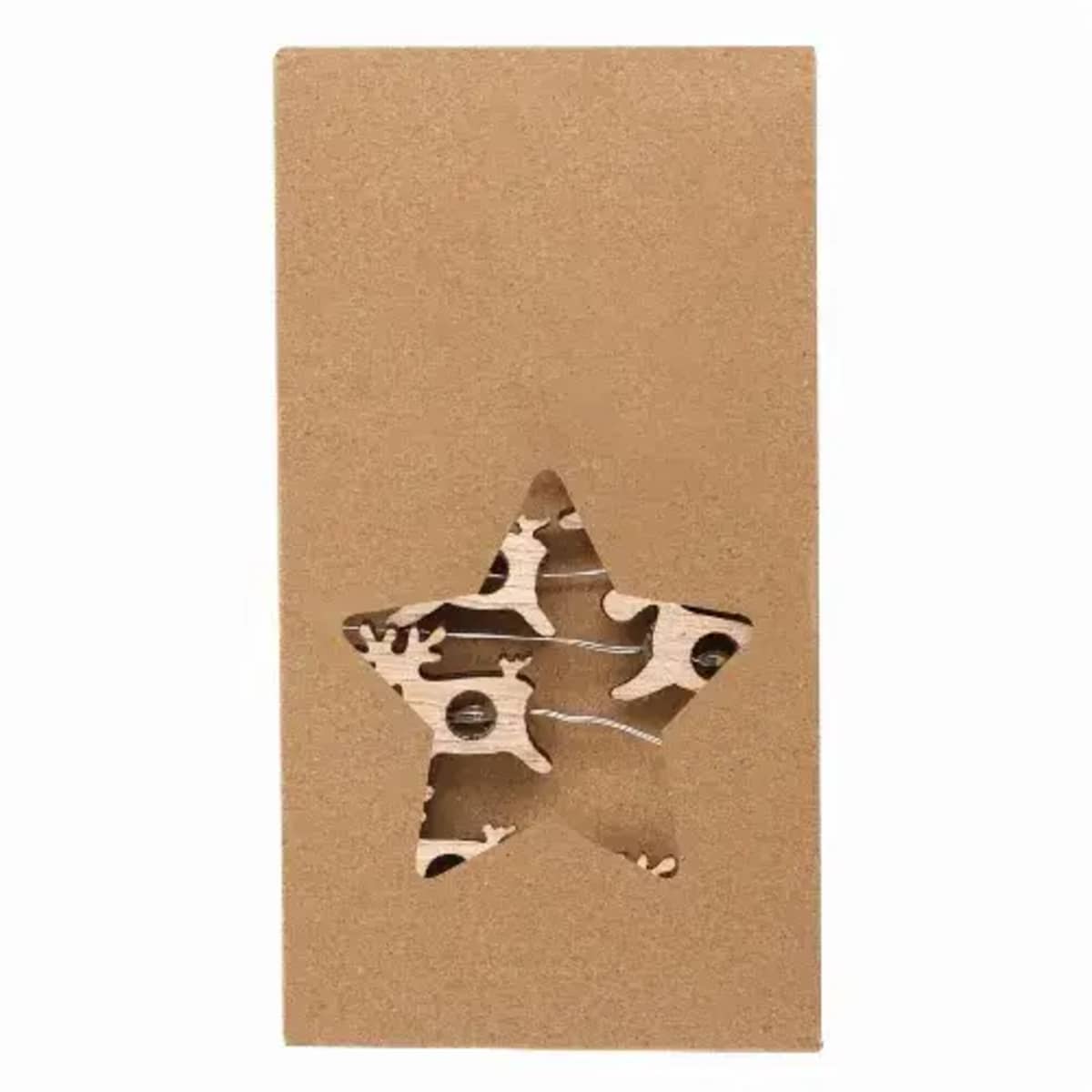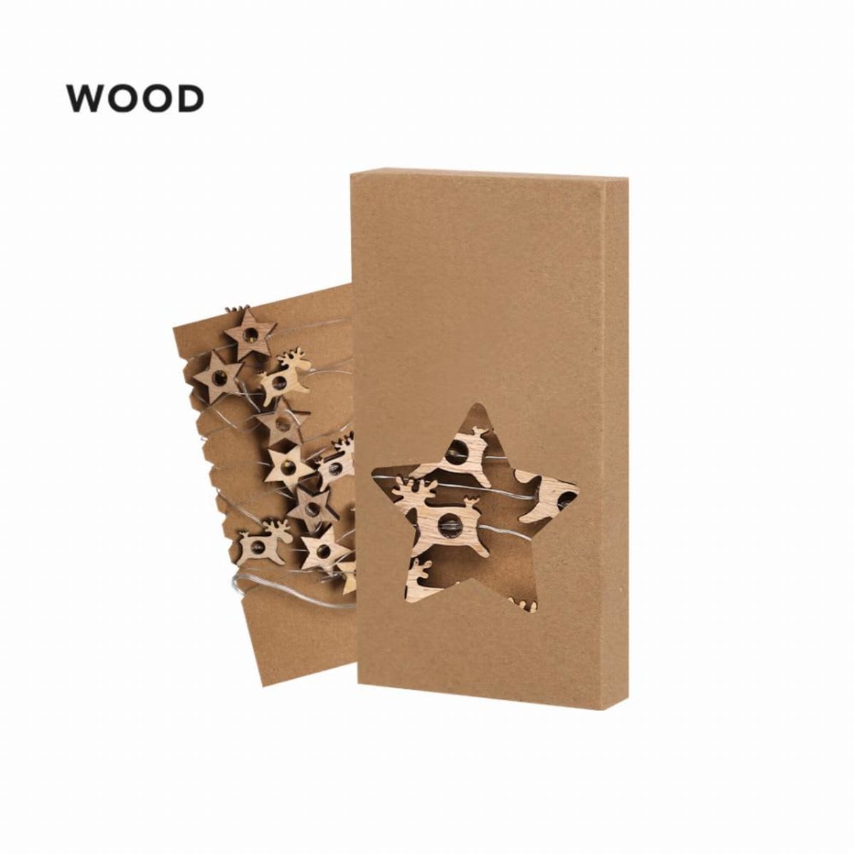 Features:  An original decoration accessory with ornaments in natural materials, combining star and reindeer shapes. With 20 warm LEDs. Battery power supply (2xAA not included). Presented in an attractive kraft box with star shaped die cut.Made with plant-based