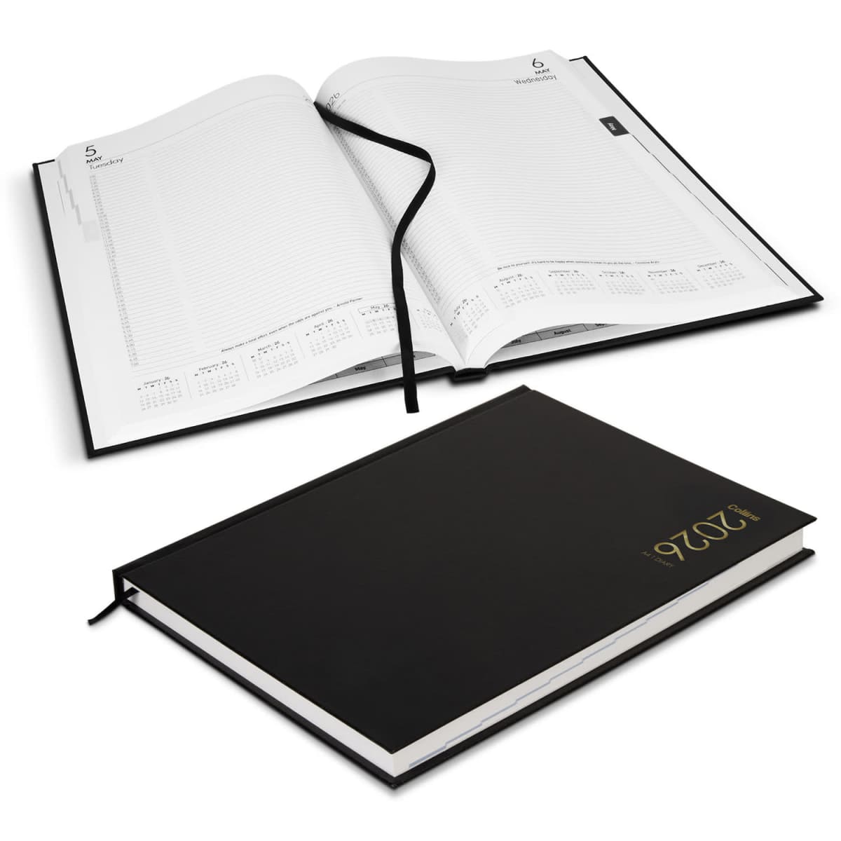 * A4 diary with durable black textured hard cover and convenient ribbon marker