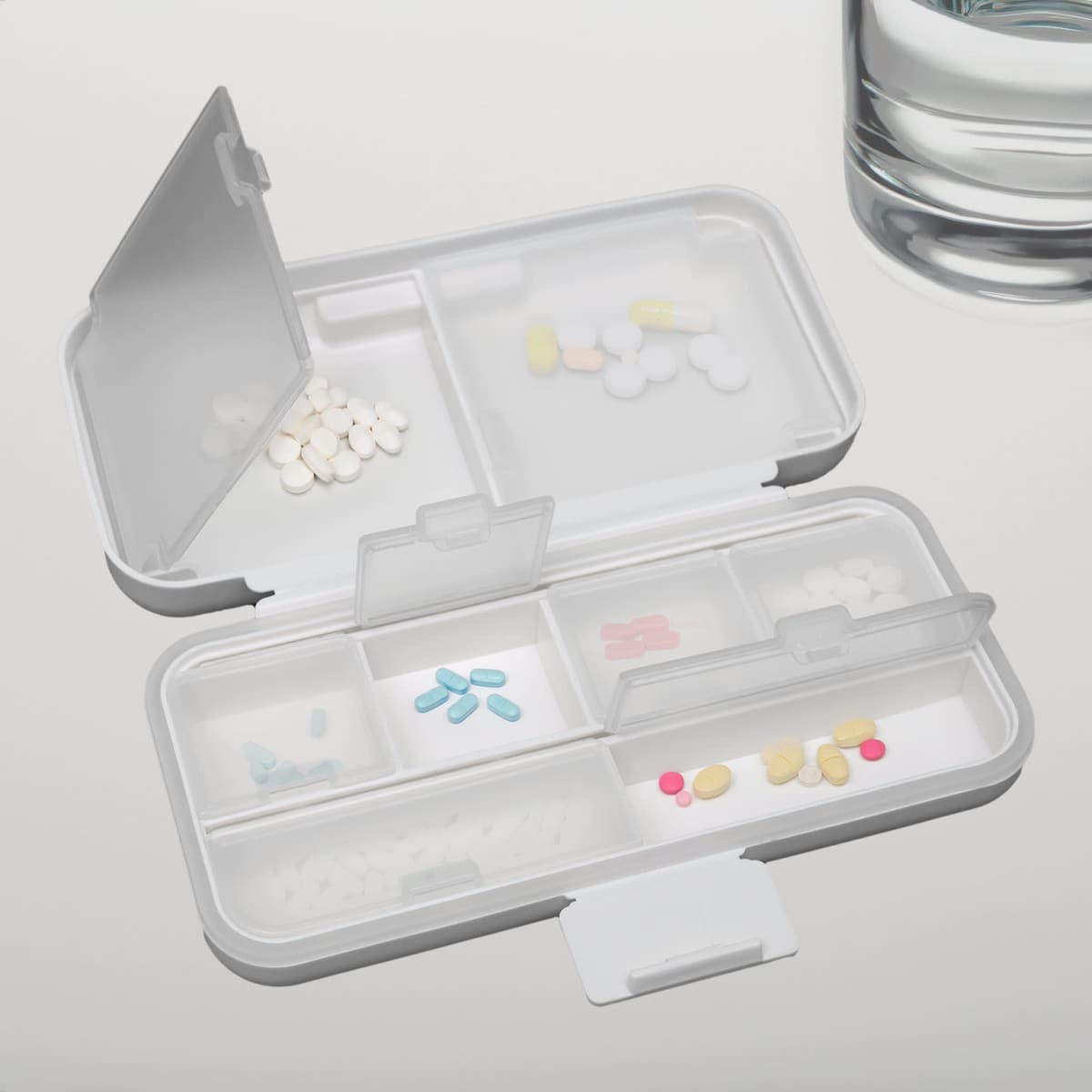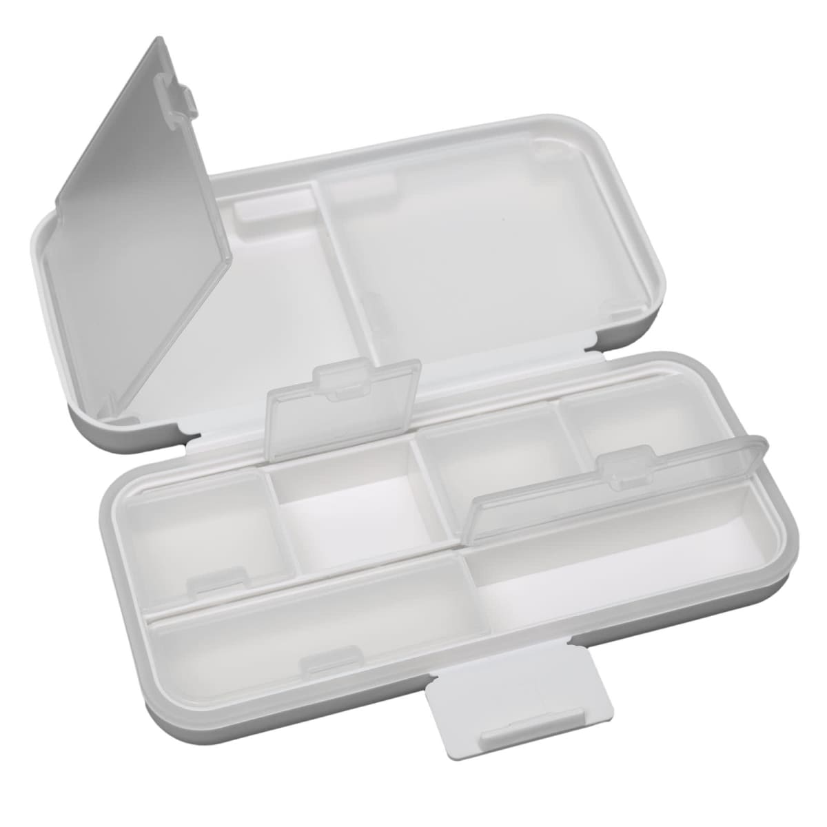 The Compact Pill Organiser is a versatile solution for all your storage needs. Featuring eight individual compartments in three different sizes, this organiser is perfect for pills, supplements, or small items like vitamins and craft supplies. Each compartment has a push-to-close lid for secure storage and easy access. The solid white case and frosted compartments offer a sleek, modern look while keeping everything visible.