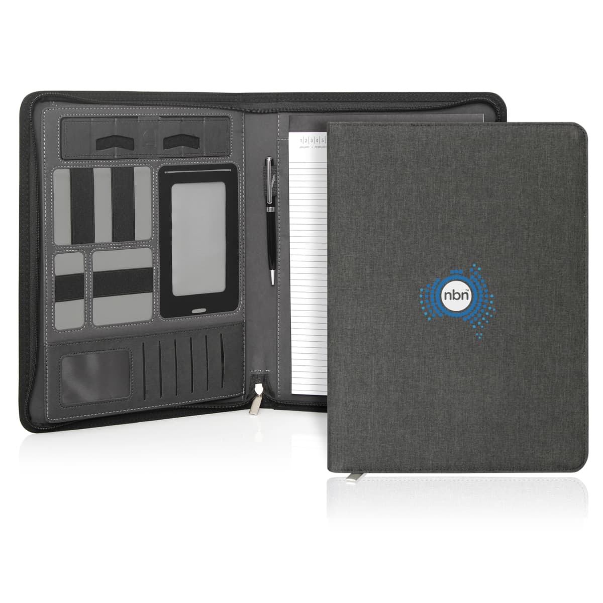 Finished in a light black poly linen, this beautifully designed compendium includes many of the essential features required by today's businessman/woman and student. It includes a large pocket, Velcro adjustable tablet/phone stand, mobile phone sleeve (fits most phones) with a touch sensitive contact window, multiple card and accessory holders, pen loop and A4 notepad. Normal freight charges apply to ON SALE NOW items