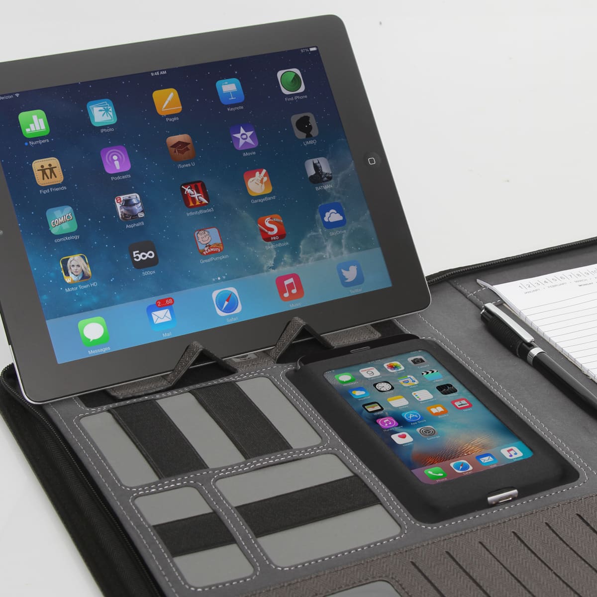Italian PU*Large pocket*Velcro adjustable tablet/phone stand*Mobile phone sleeve (fits most phones) with a personal contact window*Multiple card and accessory holders*Pen loop*A4 notepad*Pen not included