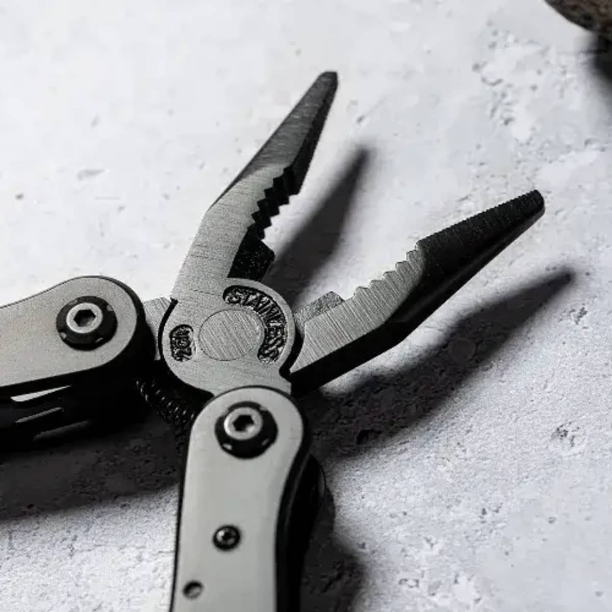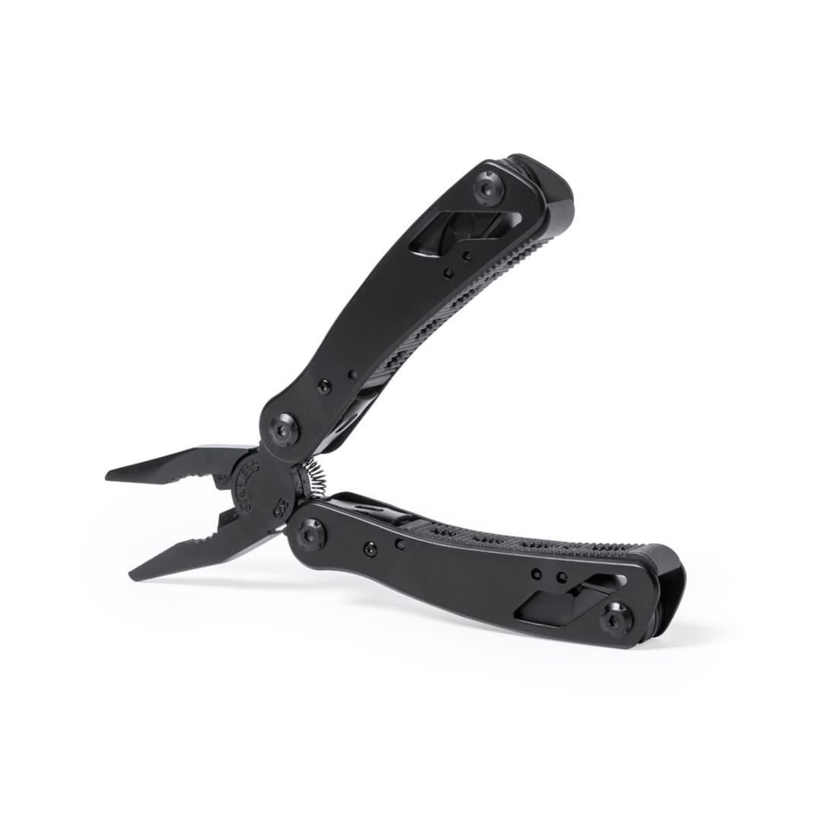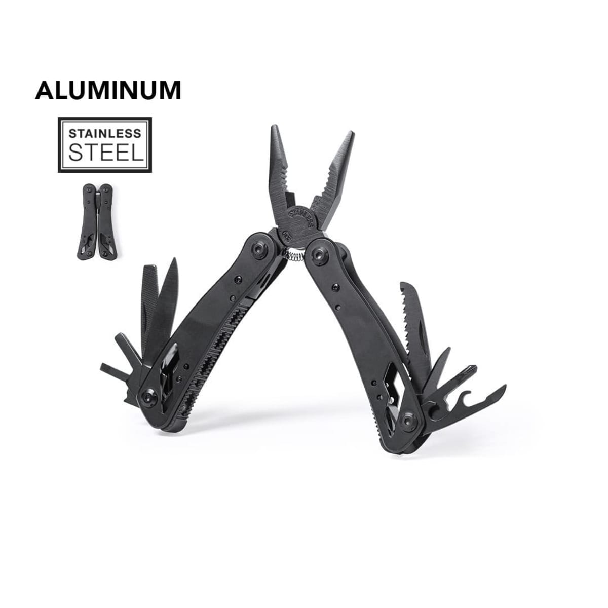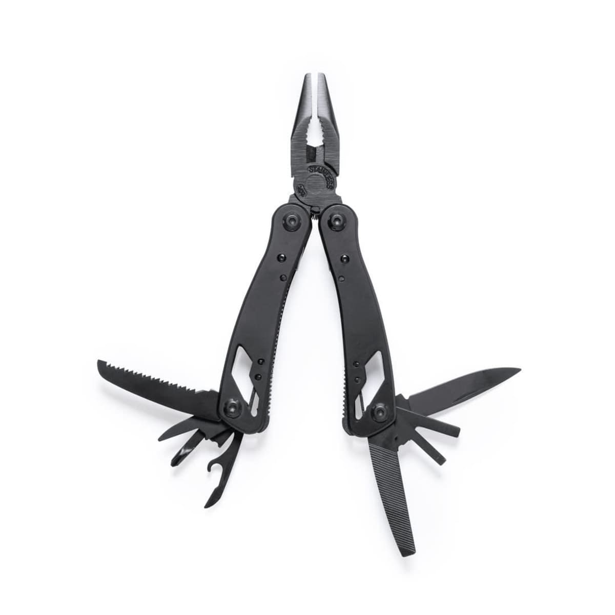 Multi-tool with accessories in stainless steel with black finish, and matching resistant aluminium handle.