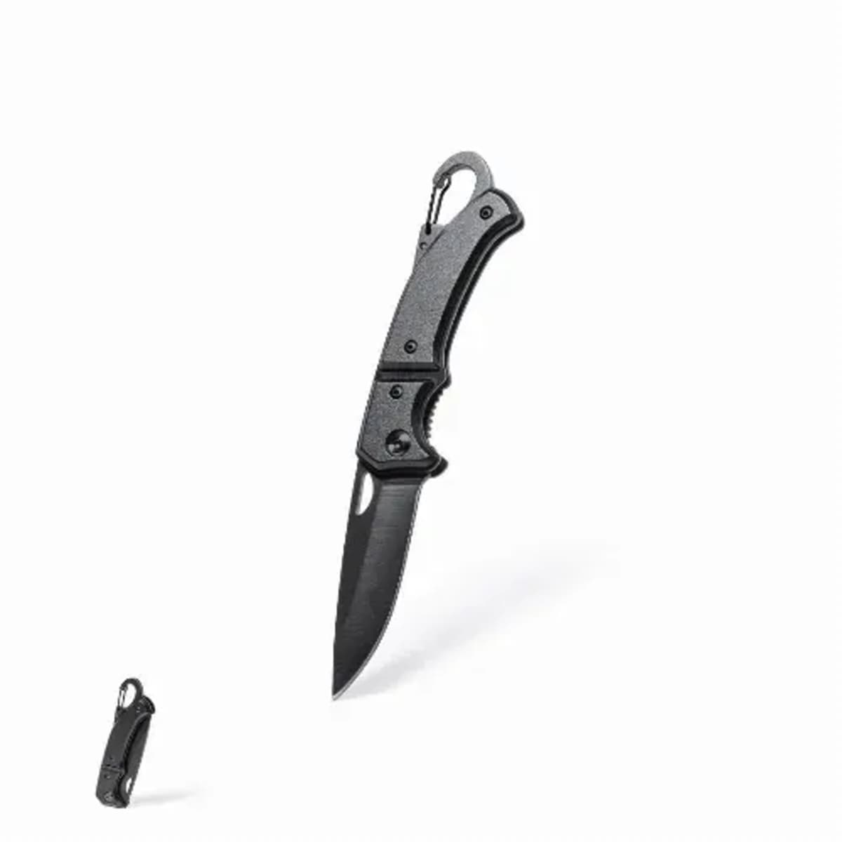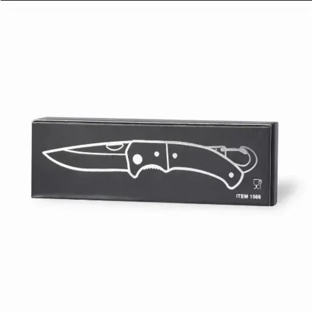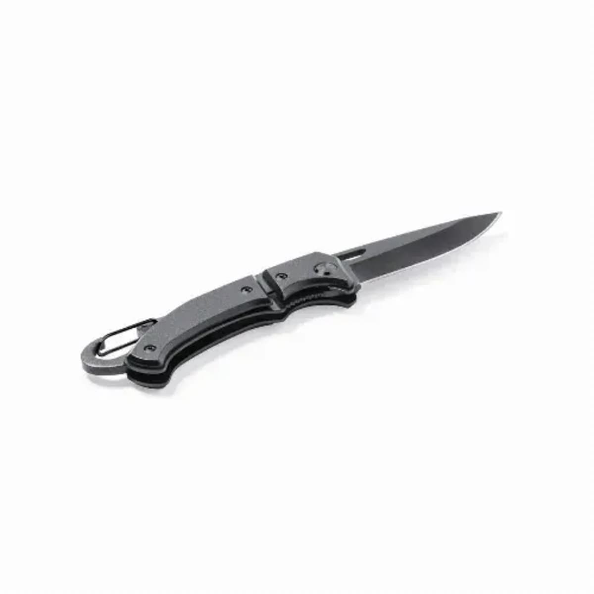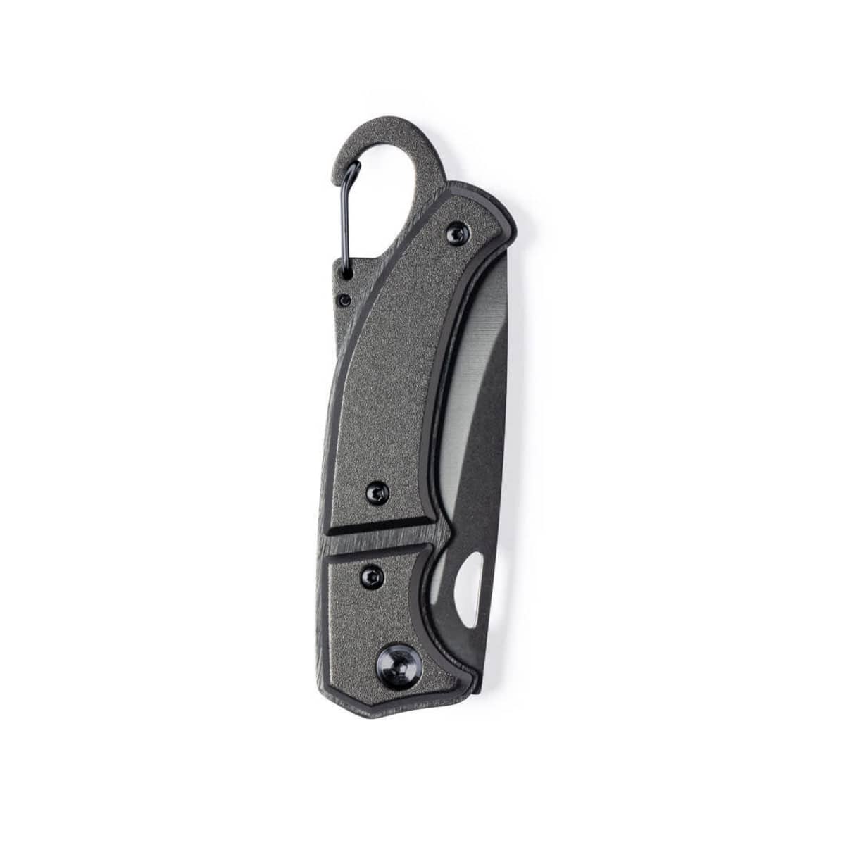 With integrated carabiner in handle and safety lock. Die-cut in blade for easy opening and presented in an individual box in black design.