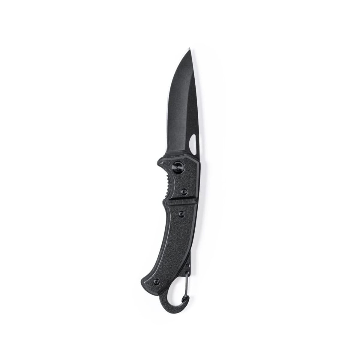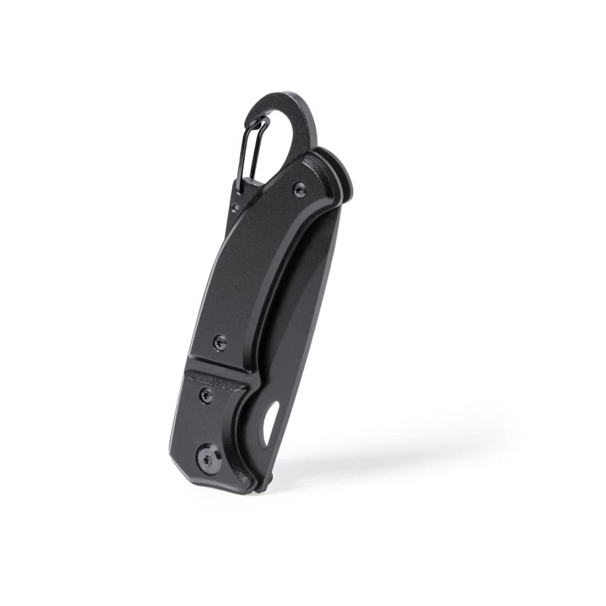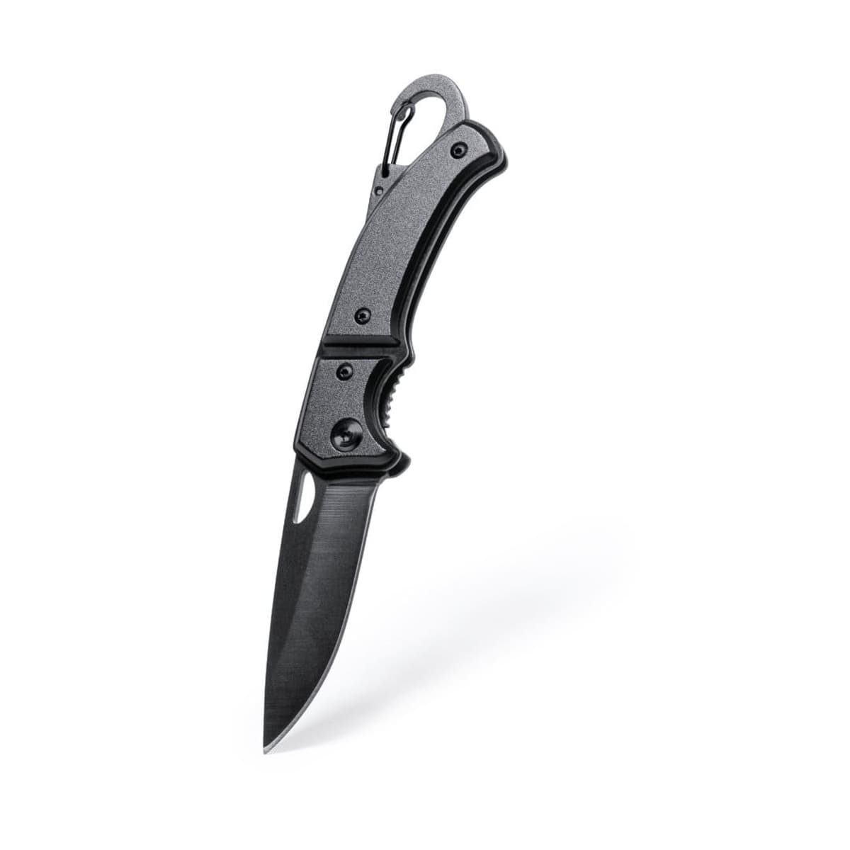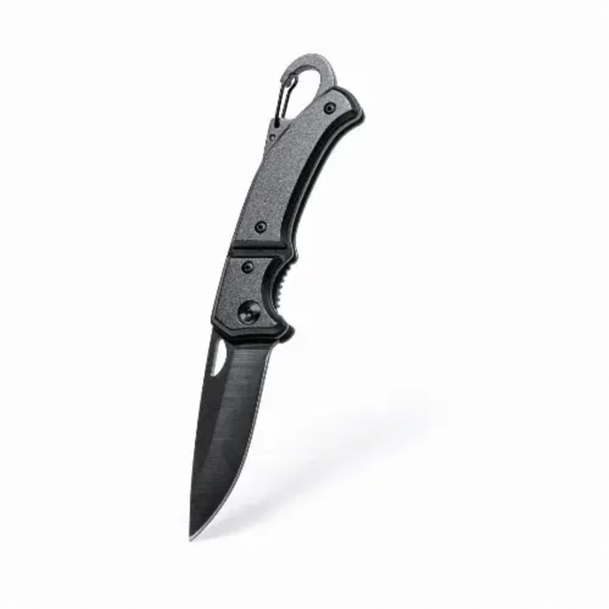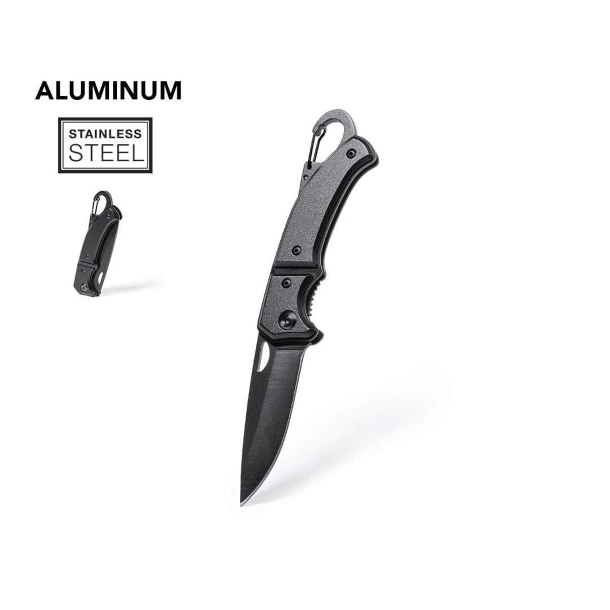 With integrated carabiner in handle and safety lock. Die-cut in blade for easy opening and presented in an individual box in black design.
