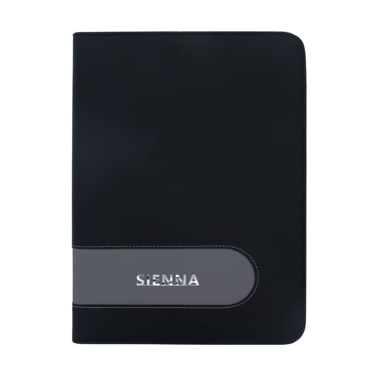 This black smooth PVC cover with grey trim is all about professional polish. Inside, you’ll find a lined A4 notepad, pen loop, multiple business card holders, and a handy inside zippered pocket. Plus, it’s compatible with the optional dual-powered D980 calculator, making it the perfect companion for any meeting or event.