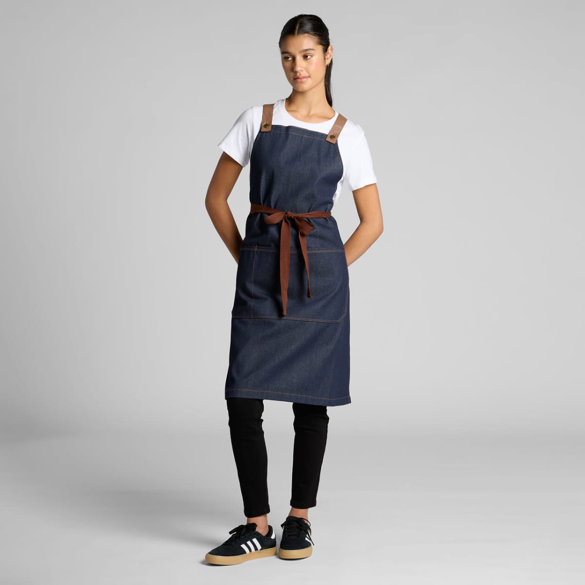 Heavyweight 350 GSM 100% cotton apron featuring removable herringbone straps, leather trim, metal eyelets, and a large front pocket. Measuring 90cm long with a 76cm waist, it's both durable and stylish.