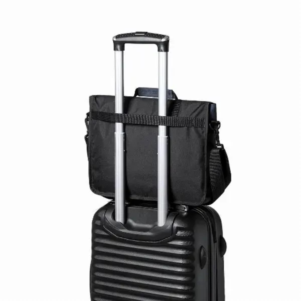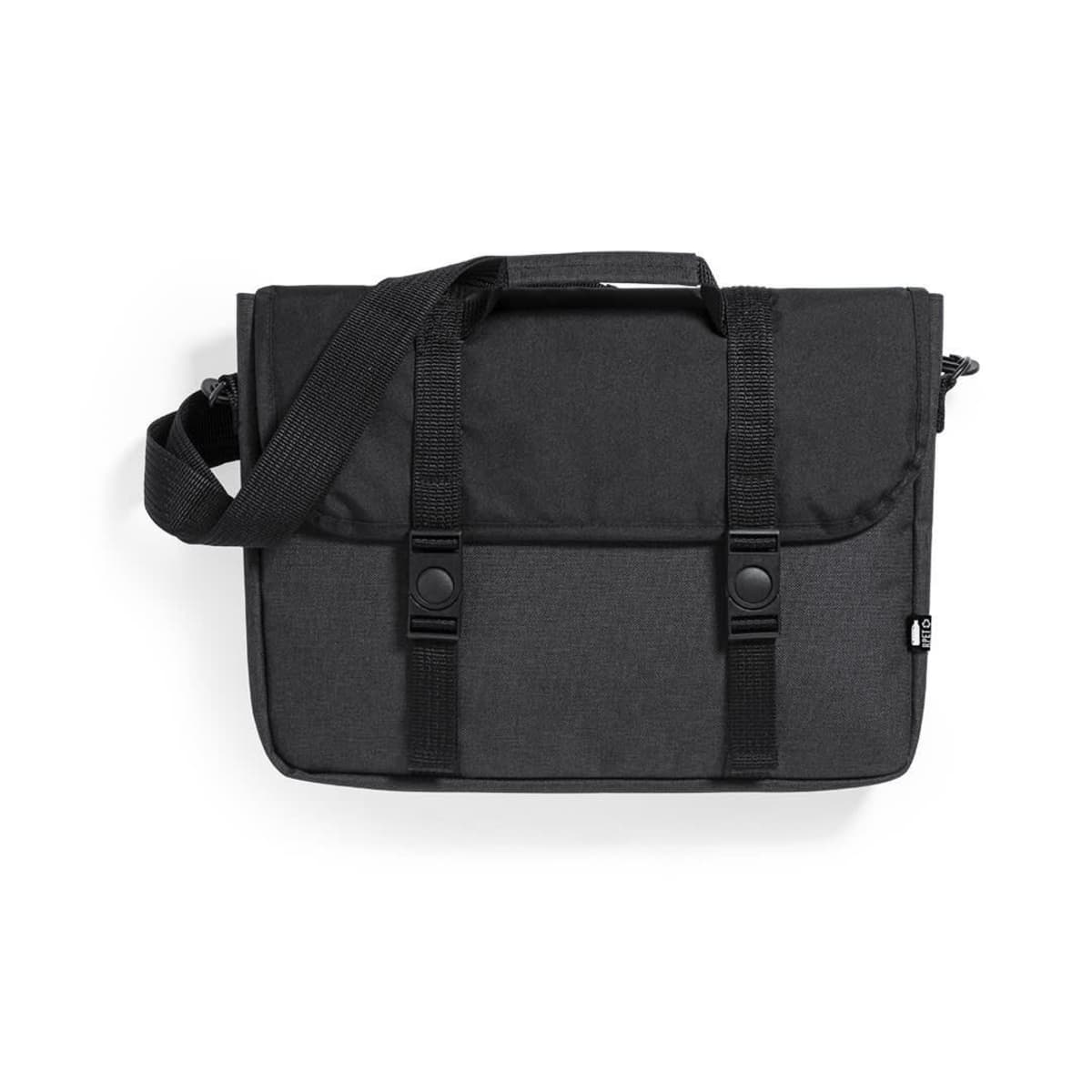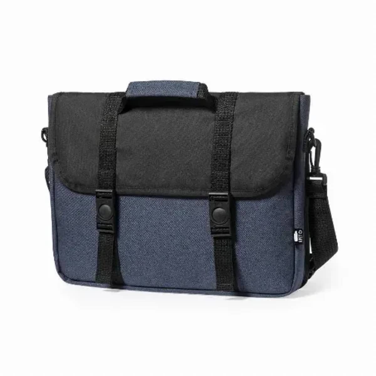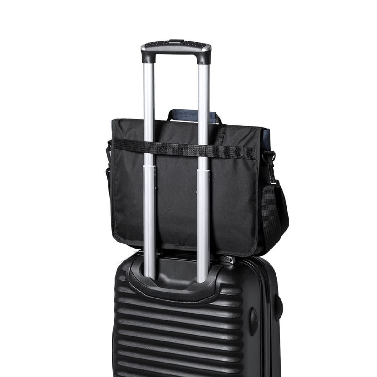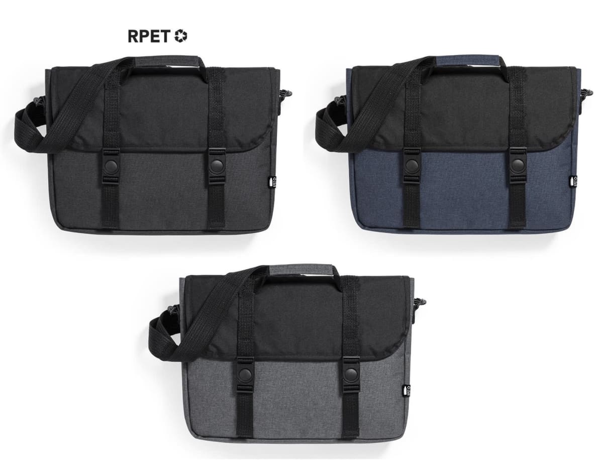 With padded main pocket and buckle closure straps inside pocket with zip closure and adjustable shoulder strap. Reinforced carrying handle and trolley bar fitting at the back. Resistance up to 7kg, with RPET emblem on outside label.