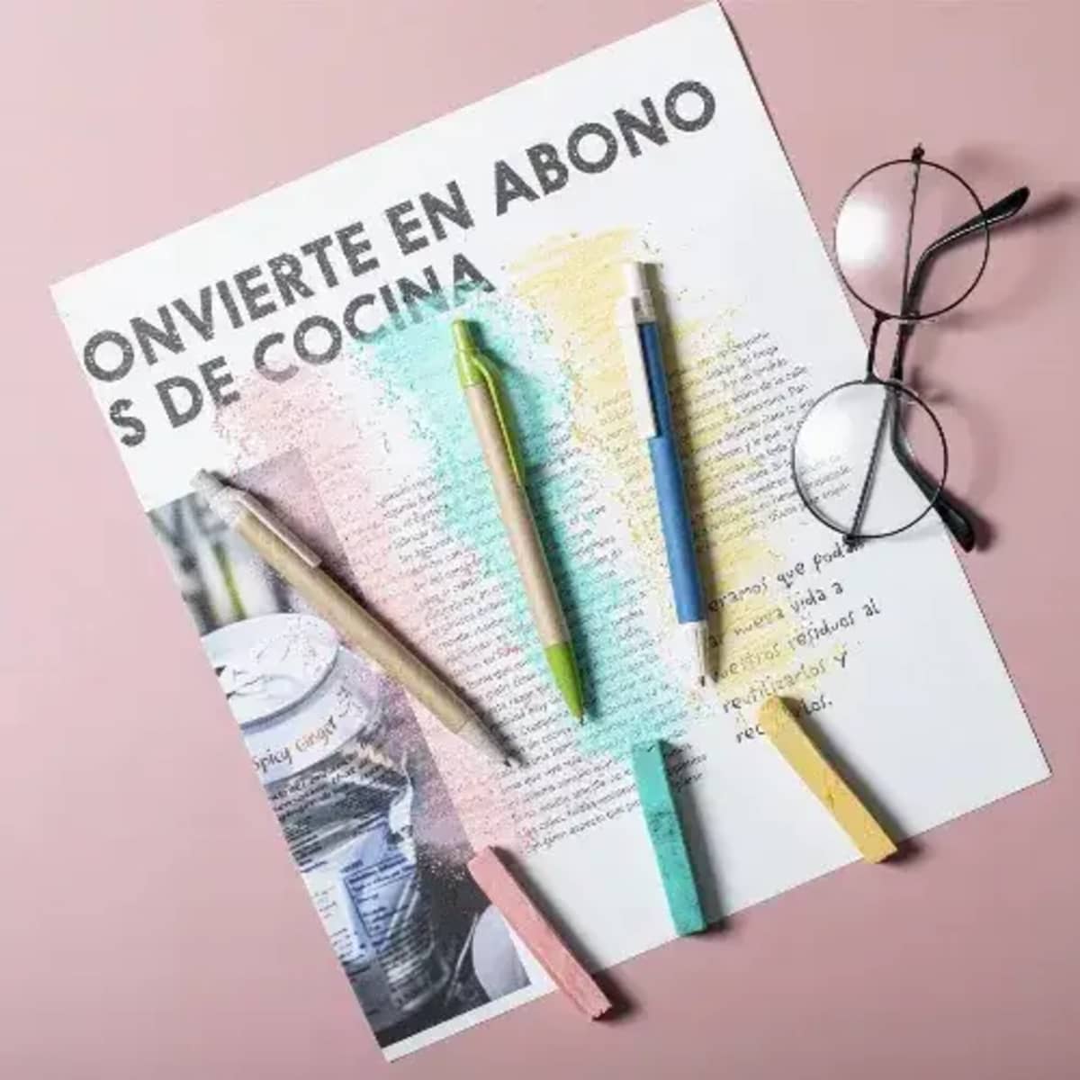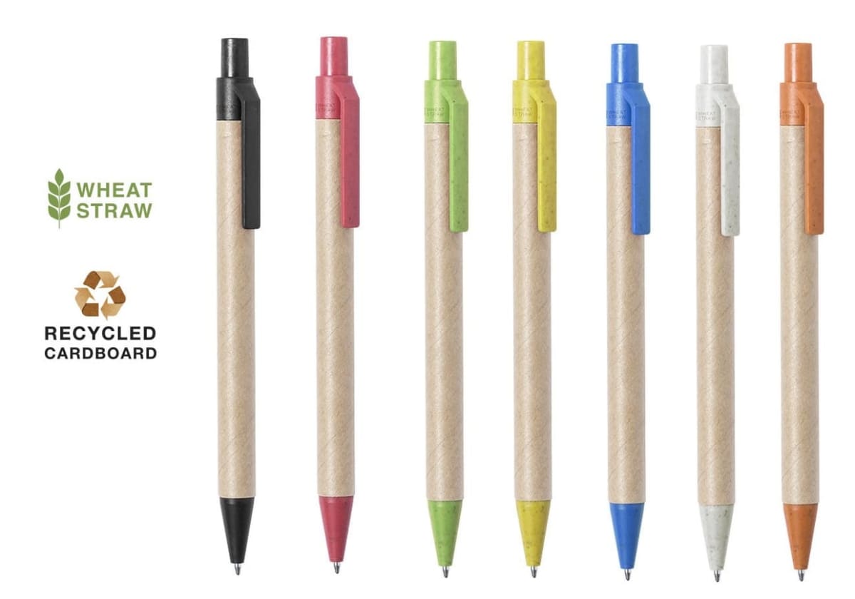 Features:  Combination of body in recycled cardboard in natural colour and accessories in wheat cane and ABS , in order to promote the use and recycling of raw materials, thus reducing pollutant emissions. Available in a wide range of colours, with blue ink.