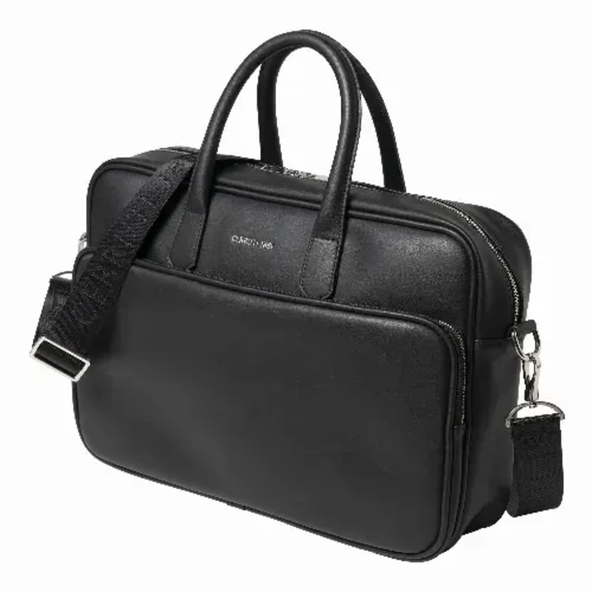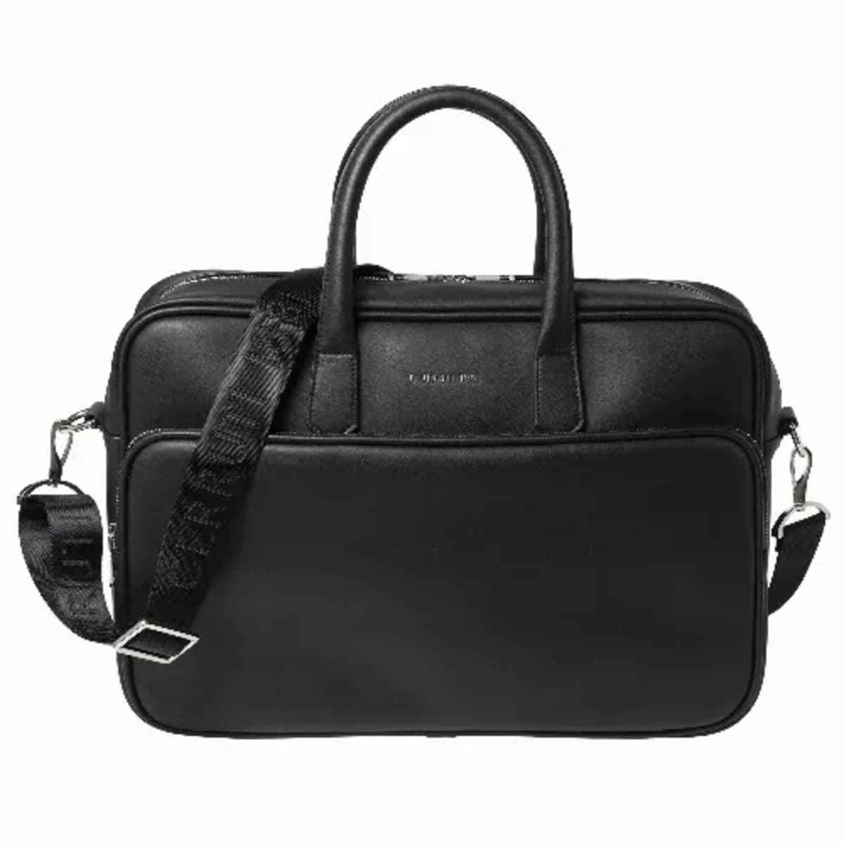 The "Zoom" document bag, with its minimalist design and contemporary feel, is made of a smooth and light black material with a shiny chrome metal signature..