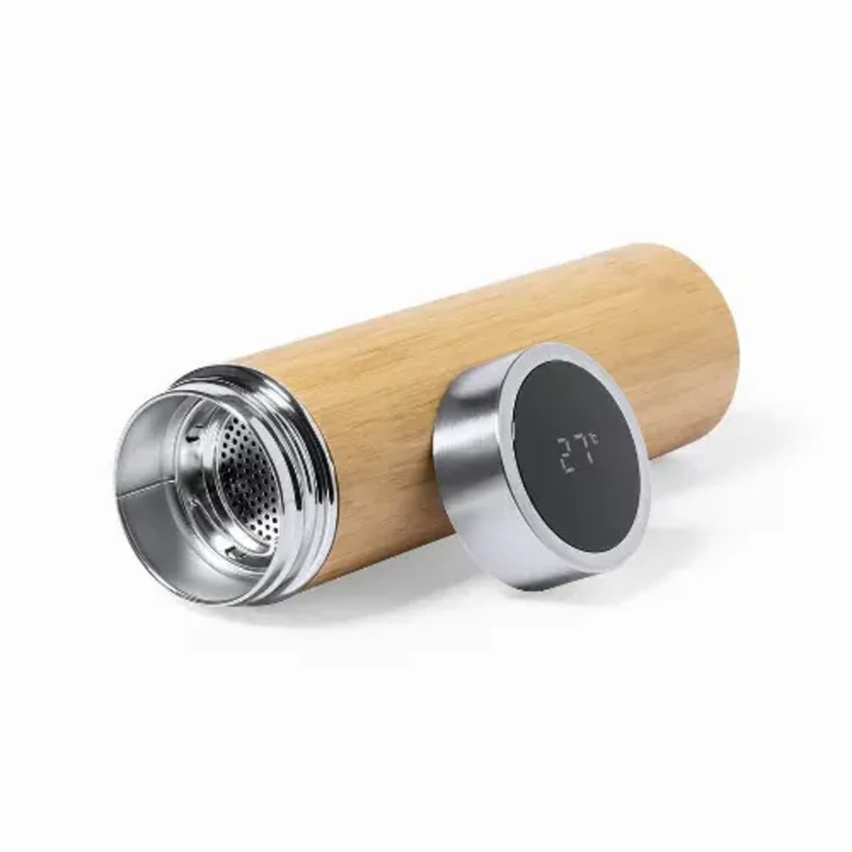 Bamboo finished, with 500 ml capacity, BPA-free safety cap, and integrated infuser. Battery operated (button cell included) and instruction manual available in English and Spanish. Presented in an attractive eco-design box.
