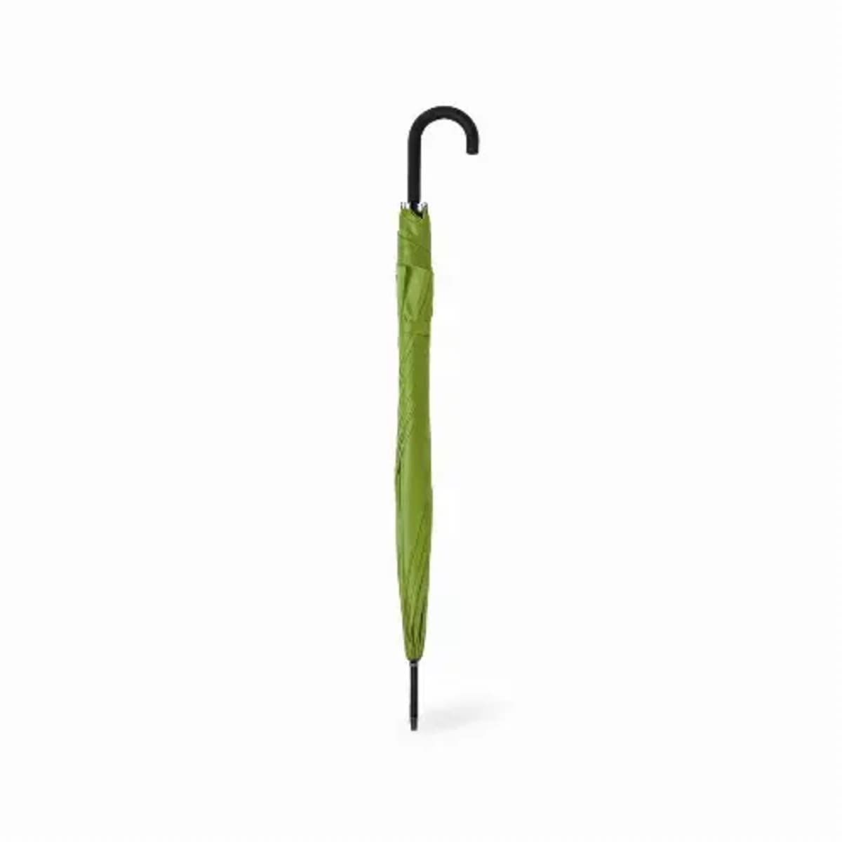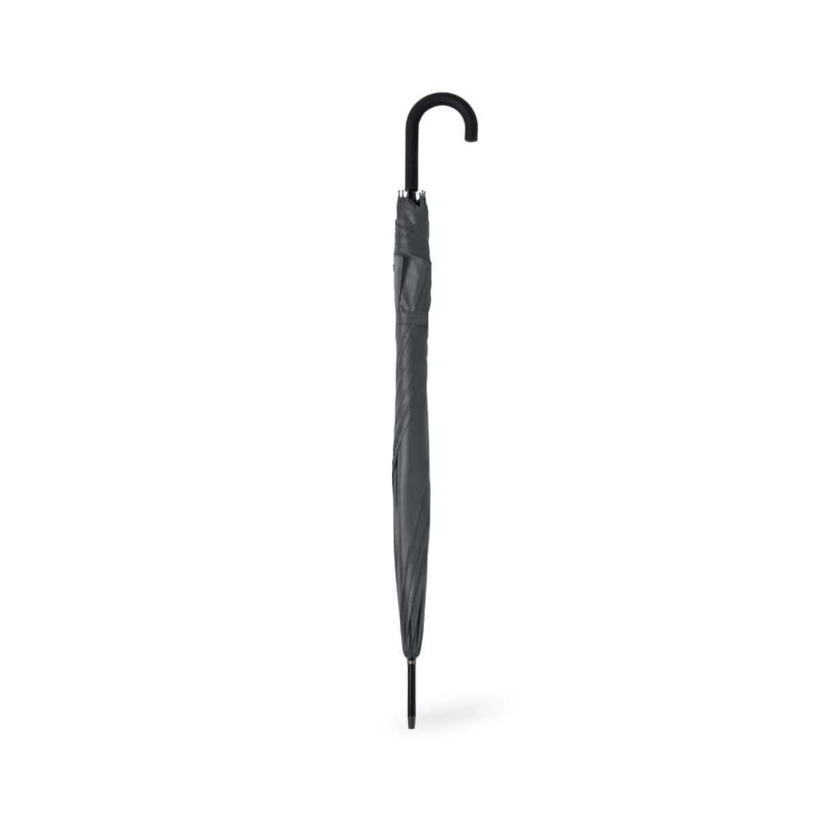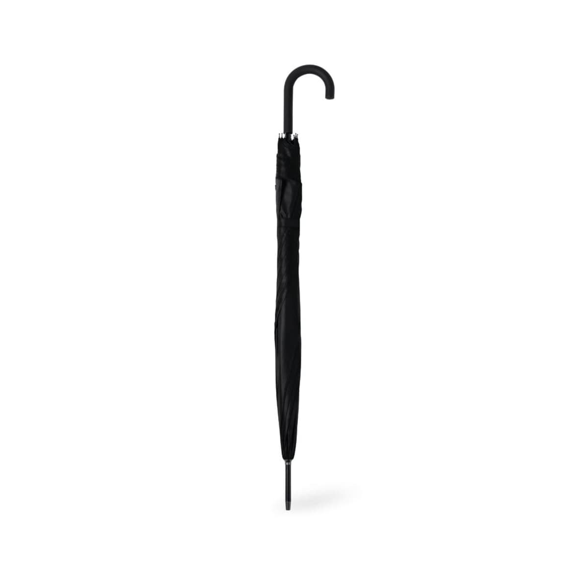 130 cm diameter, made of durable 190T pongee material. Automatic opening and windproof mechanism. Black fibre ribs, with curved handle and velcro closure strap. Available in a wide range of colors.