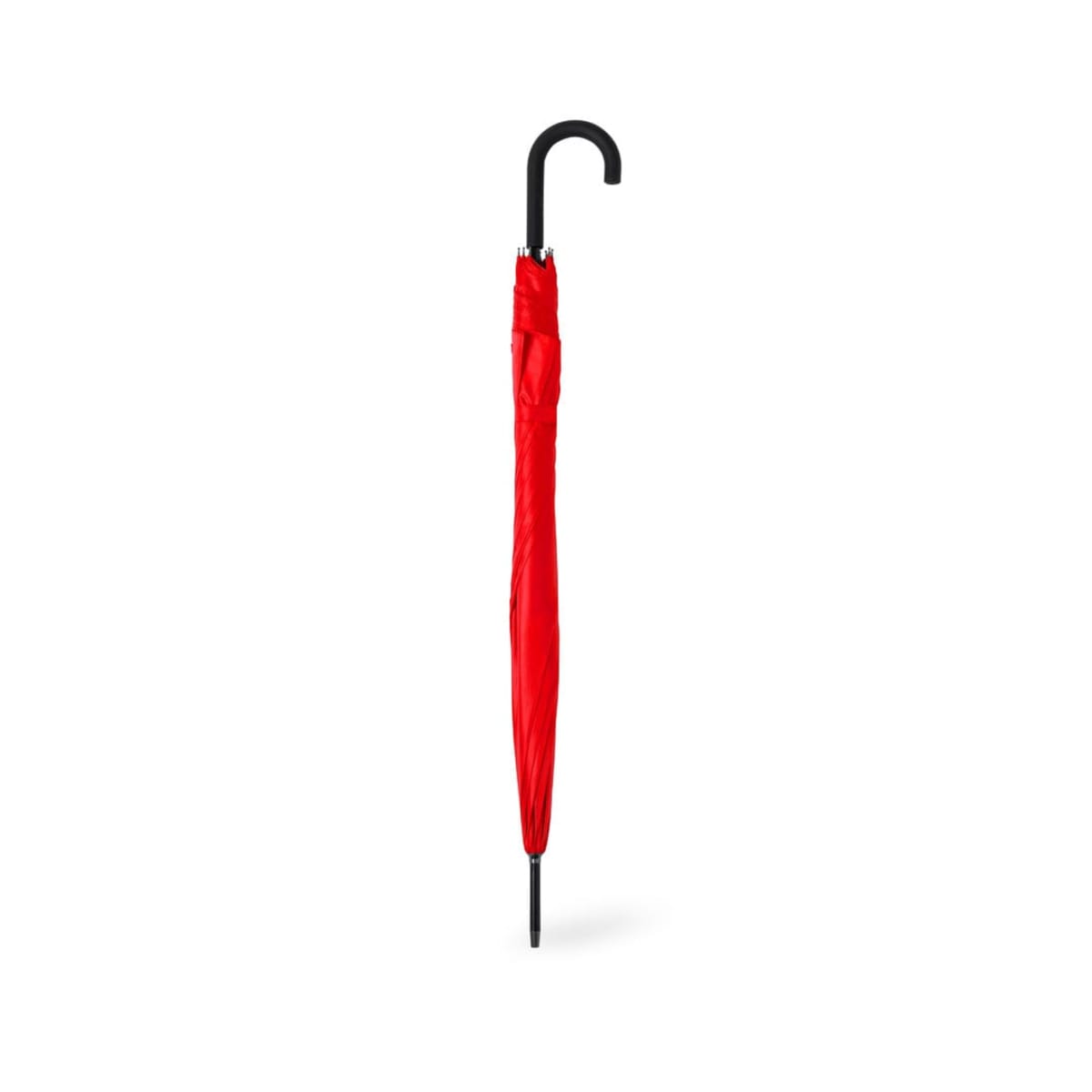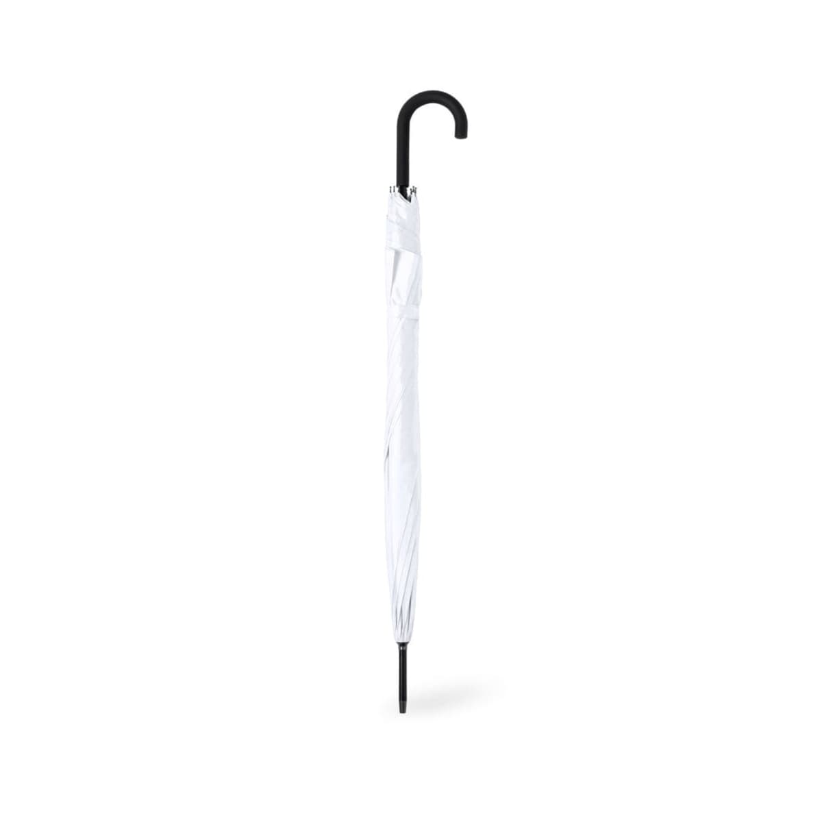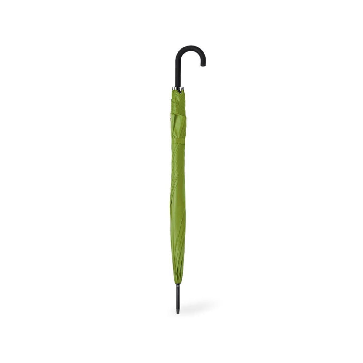 130 cm diameter, made of durable 190T pongee material. Automatic opening and windproof mechanism. Black fibre ribs, with curved handle and velcro closure strap. Available in a wide range of colors.