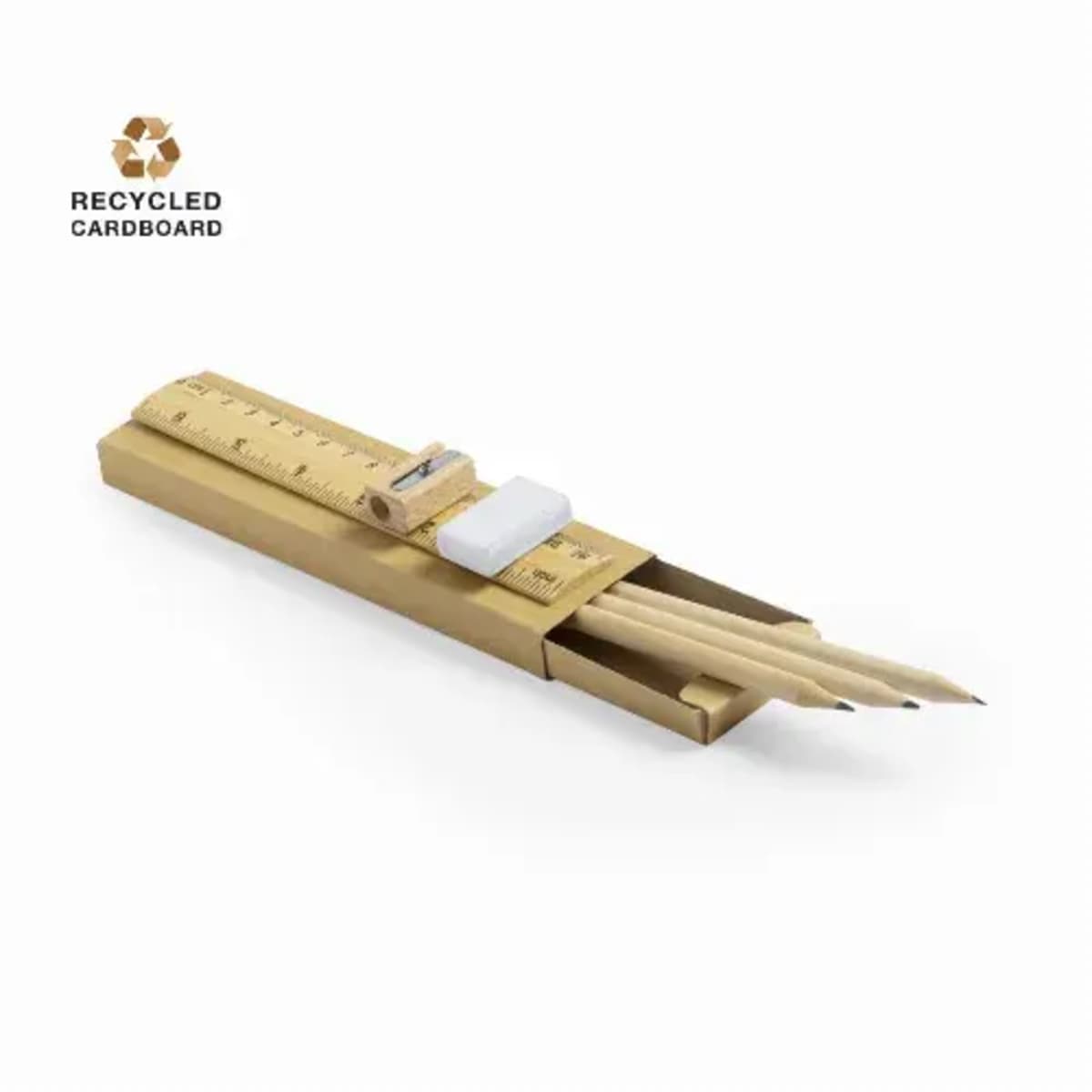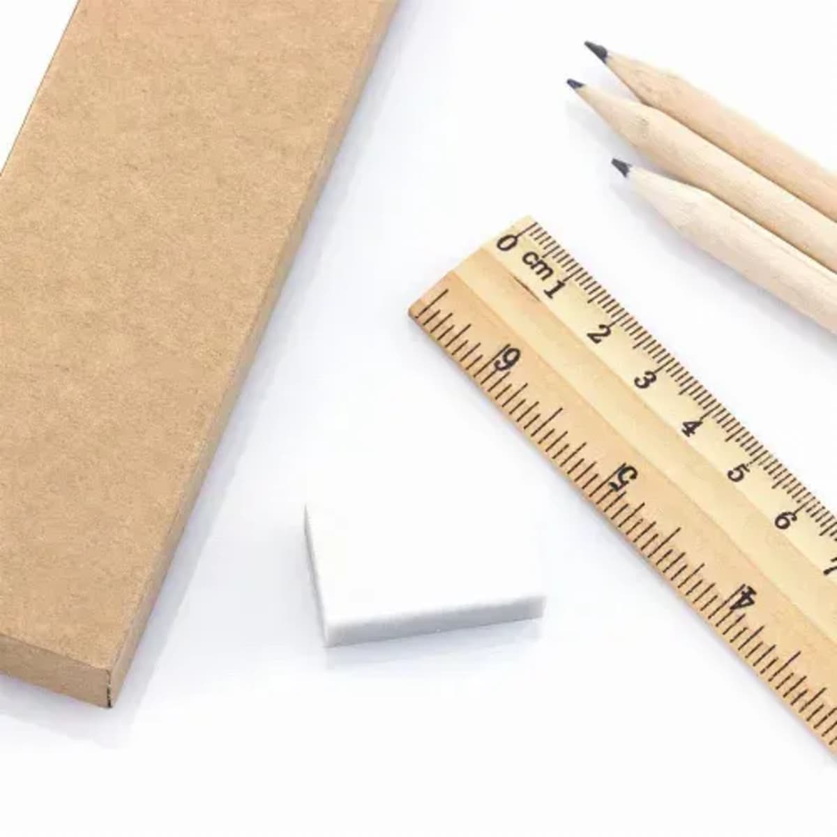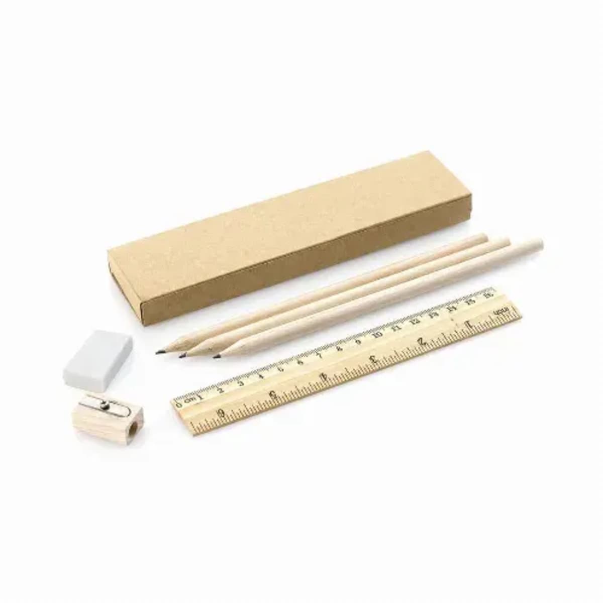 Set of 6 pieces with 3 wooden pencils with natural round body and black lead, 20cm ruler with metric system in centimeters/inches, eraser and pencil sharpener.