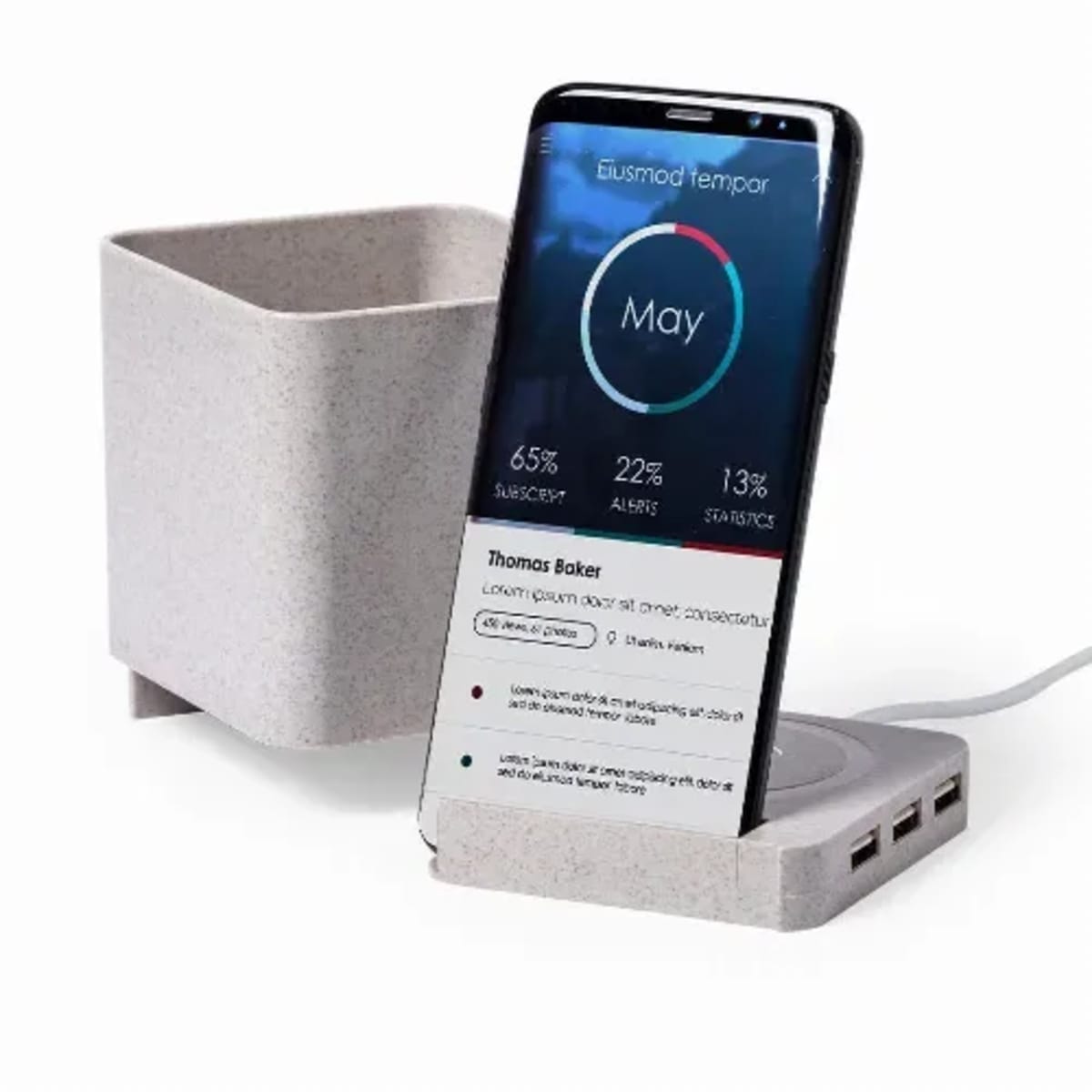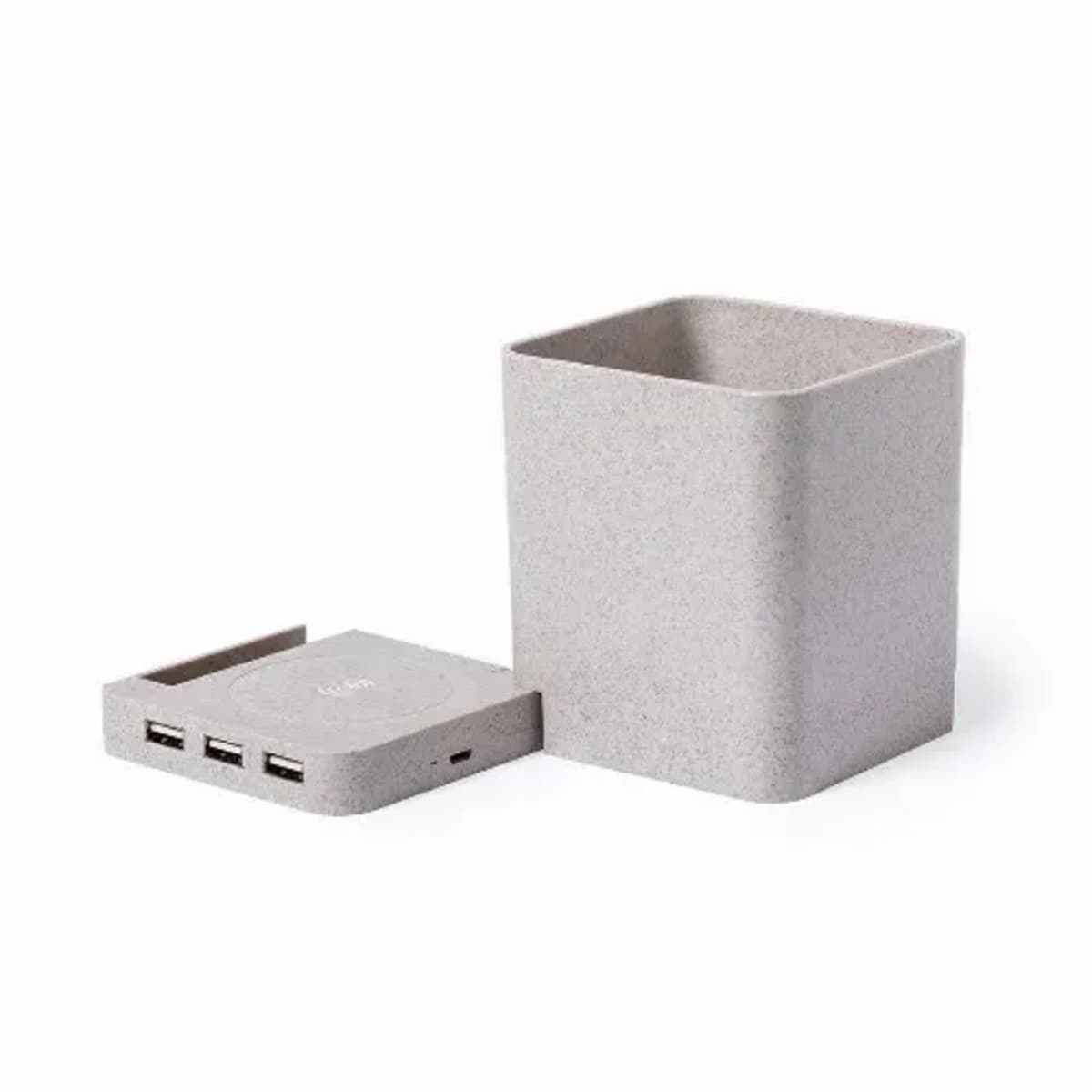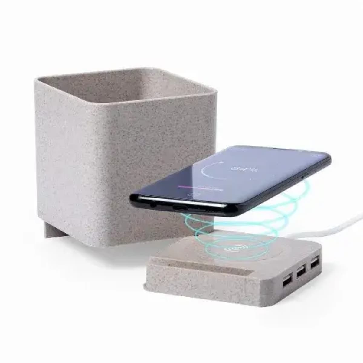 Manufactured in wheat straw, to encourage the use of natural raw materials and reducing contaminant emissions. With pen holder, smartphone holder, wireless charger and USB port (3xUSB 2.0) functions. Compatible with smartphones equipped with wirel