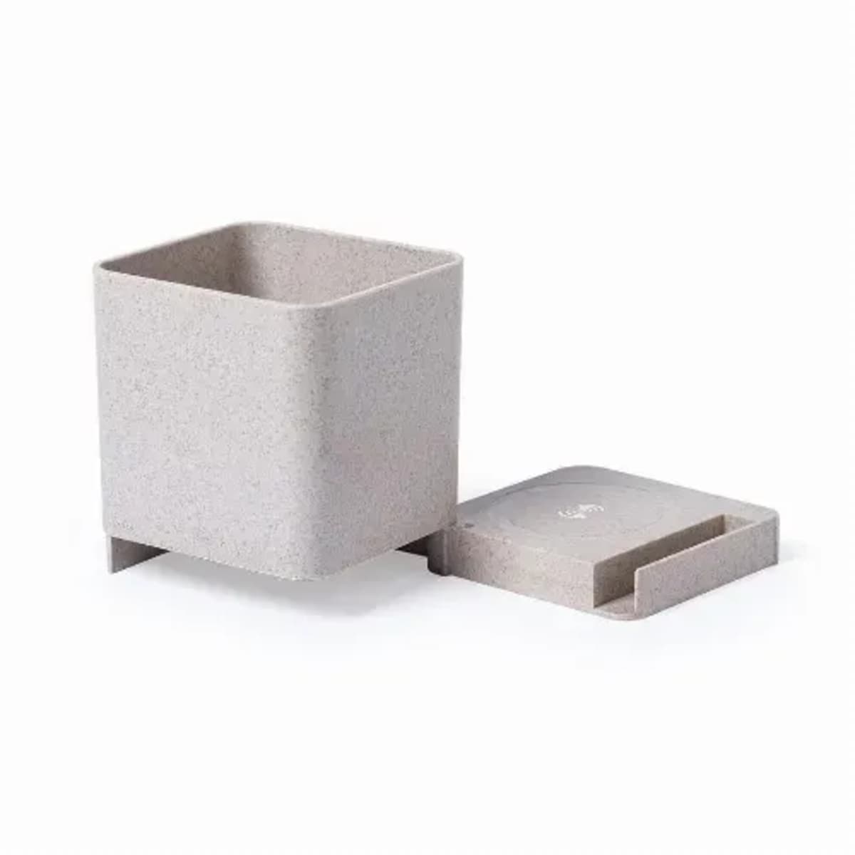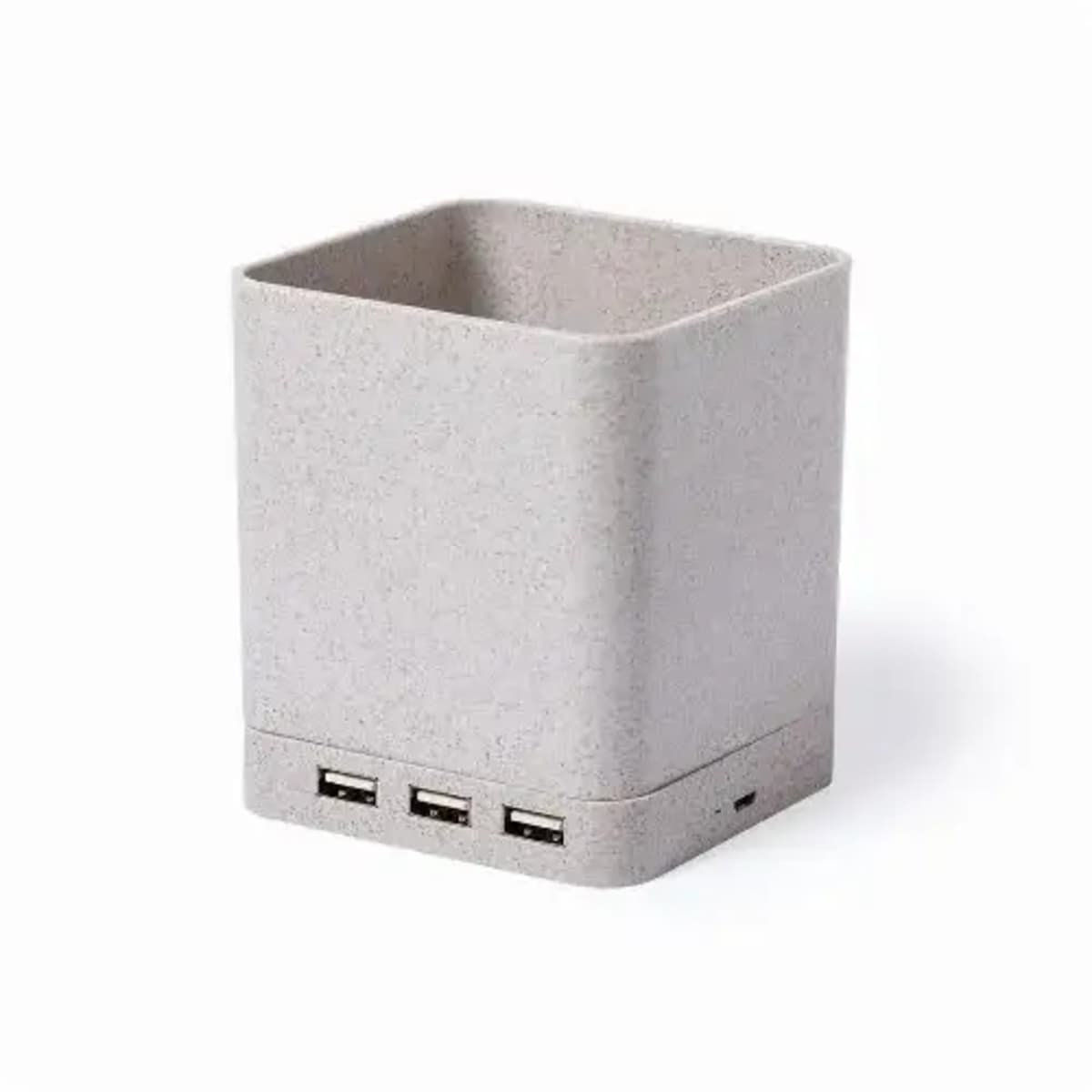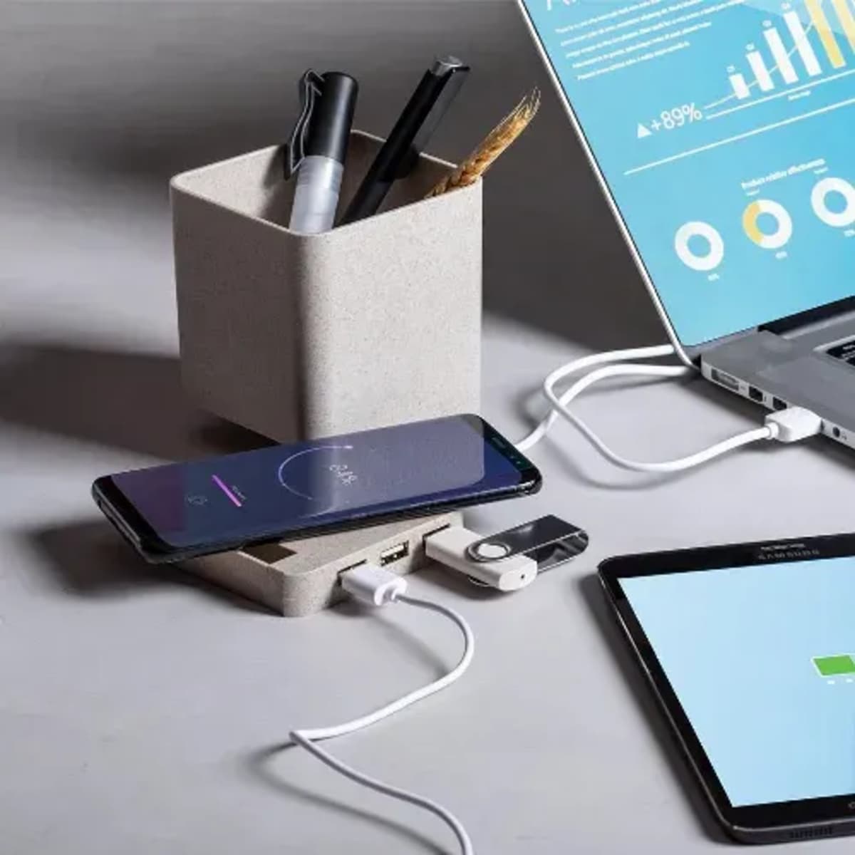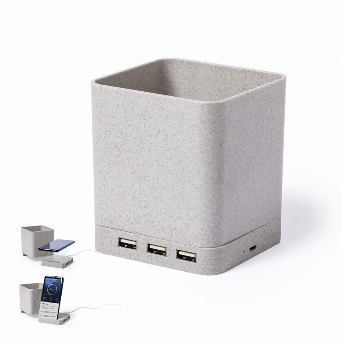 Manufactured in wheat straw, to encourage the use of natural raw materials and reducing contaminant emissions. With pen holder, smartphone holder, wireless charger and USB port (3xUSB 2.0) functions. Compatible with smartphones equipped with wirel