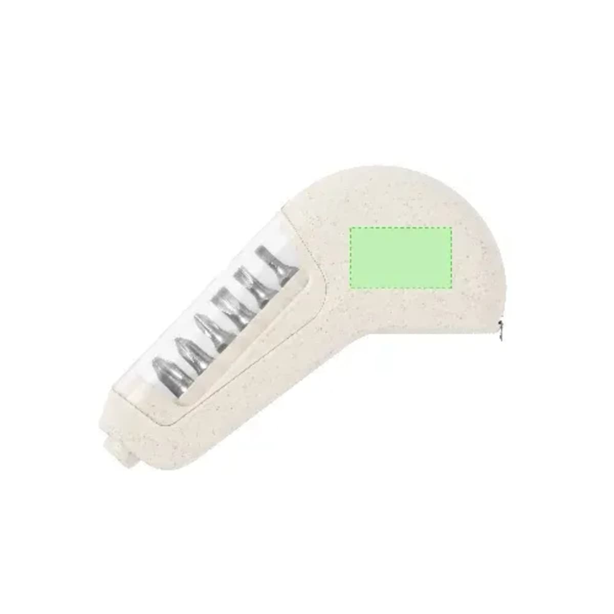 This versatile tool offers 6 functions including: inch and centimetre measuring tape ( 1 metre in length) and screwdriver function with 3 flat and 3 philips bits, all stored inside the transparent windowed handle. With wheat straw logo included. Pres