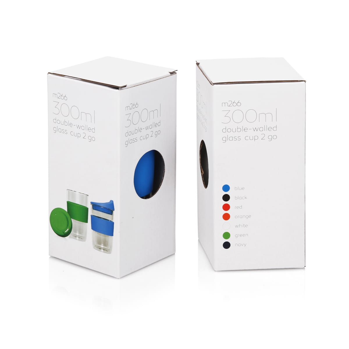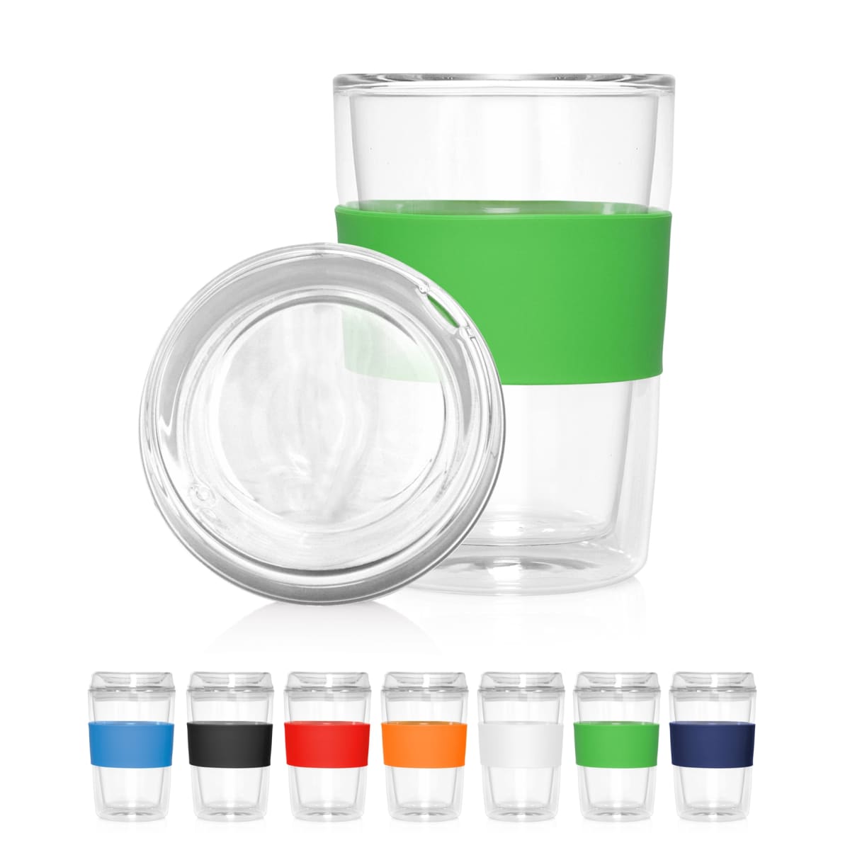 The 300ml, double-walled, glass Cup 2 Go provides an excellent return on investment. An everyday item that has the potential to be used ALL day in the home or office without the lid or in the car with the lid installed. And, of course, the more it is used the more visible the logo and the more effective the promotion. Glass is becoming an increasingly popular choice because, in addition to being environmentally responsible, it also provides a clean taste and is an exceptionally hygienic material. Logos can be printed on the silicone band. Sold in a retail quality gift box.