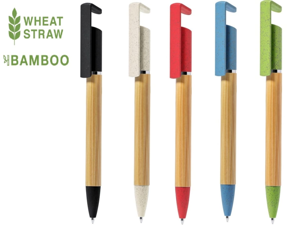 Features:  Bamboo barrel, with coloured wheat straw accessories and metal decorative elements. Twist mechanism, with integrated clip holder for mobile devices. In blue ink, with jumbo refill and available in a variety of colours.Materials such as bamboo promote