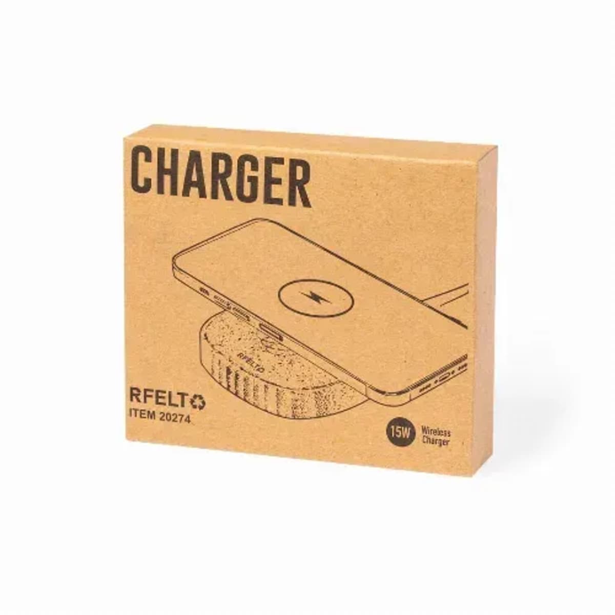 Wireless charger made of bamboo and RPET felt.Charging function of 15W and compatible with devices equipped with Qi technology.