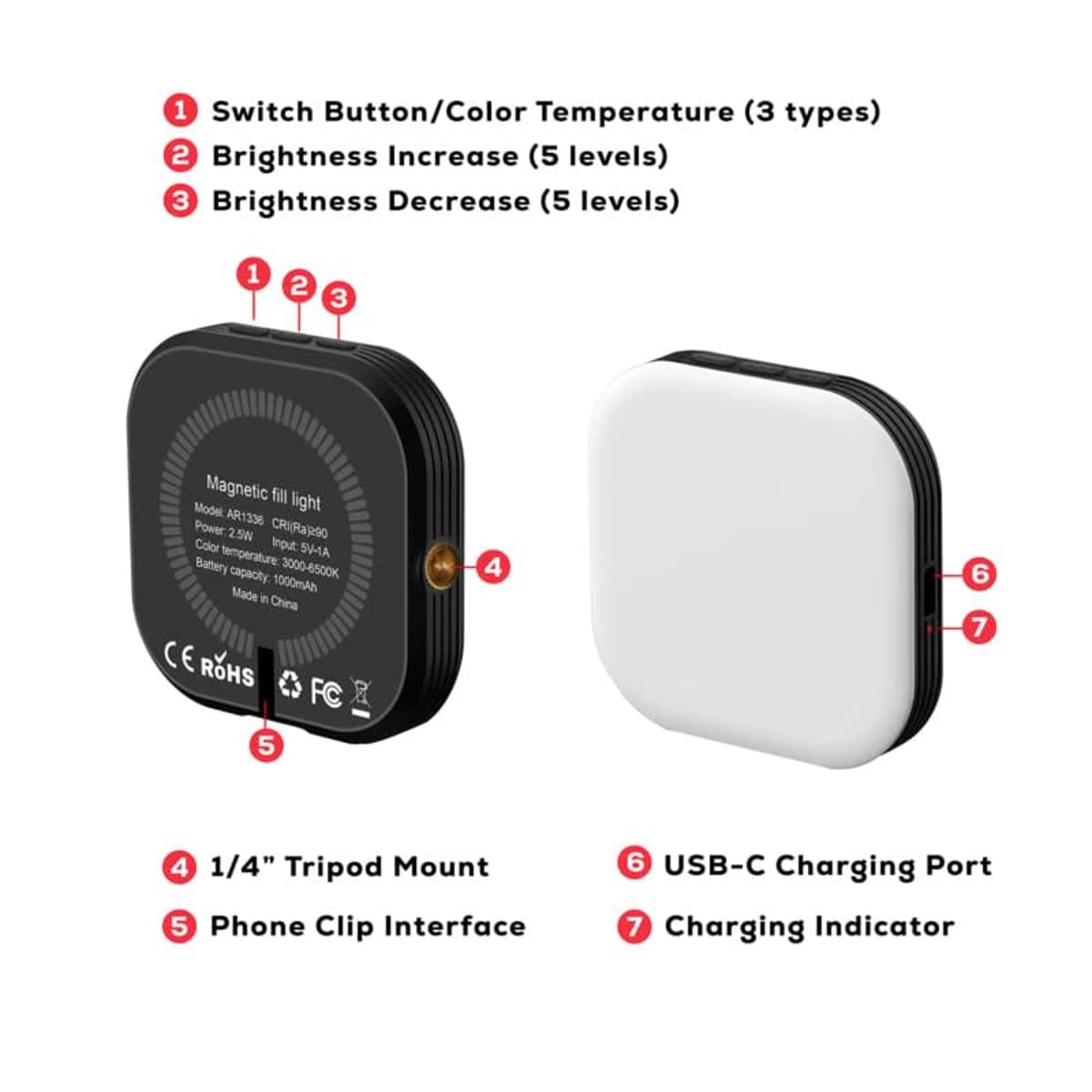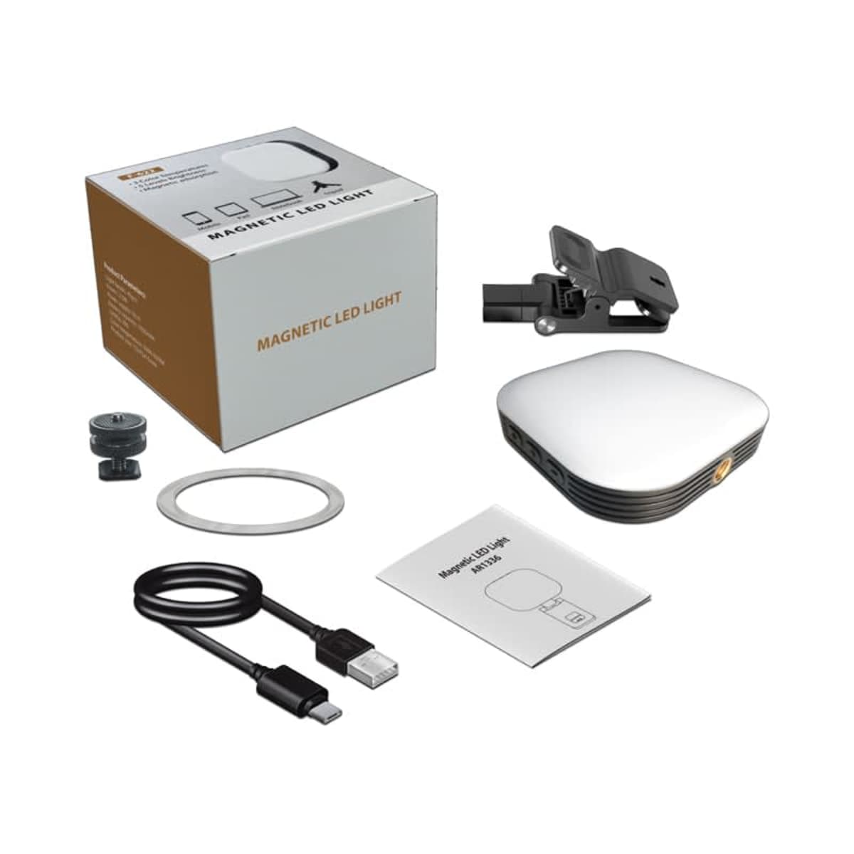 Magnetic Fill Light, 360° Multifunctional Phone Clip, Cold Shoe Base, Magnet Ring, Type-C Charging Cable and User manual.