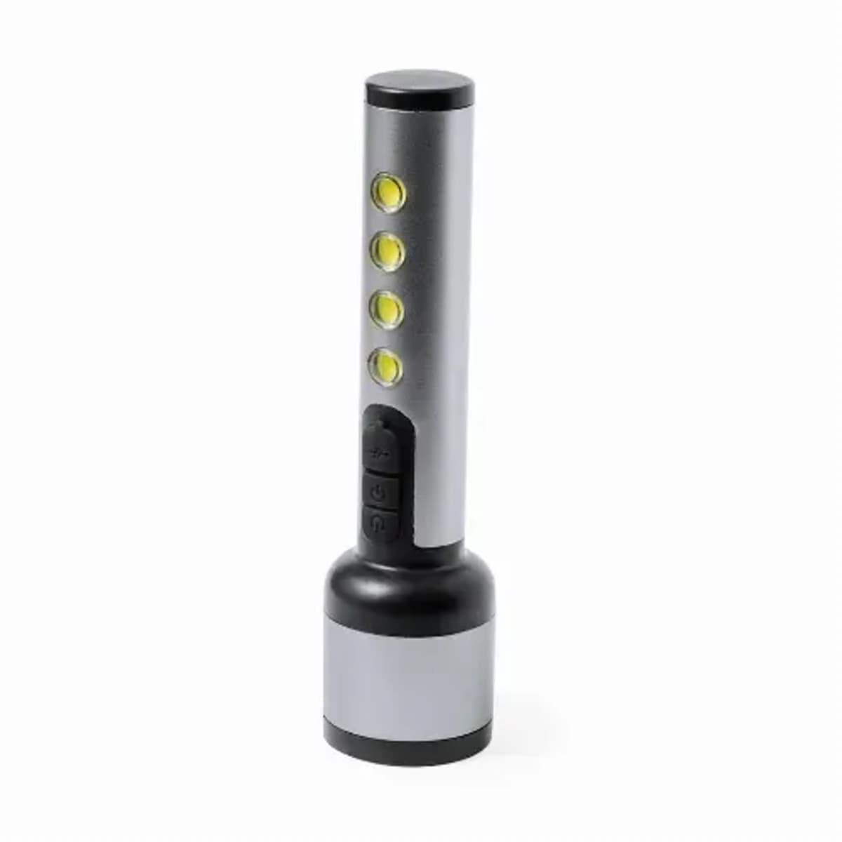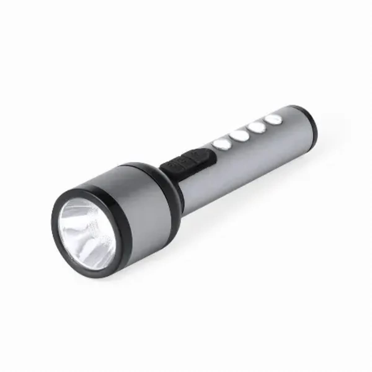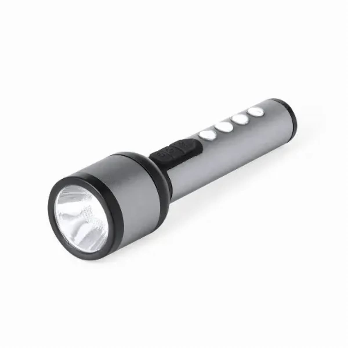 Powerful torch made of Aluminium with a classy design in a metallic grey finish with black accents.