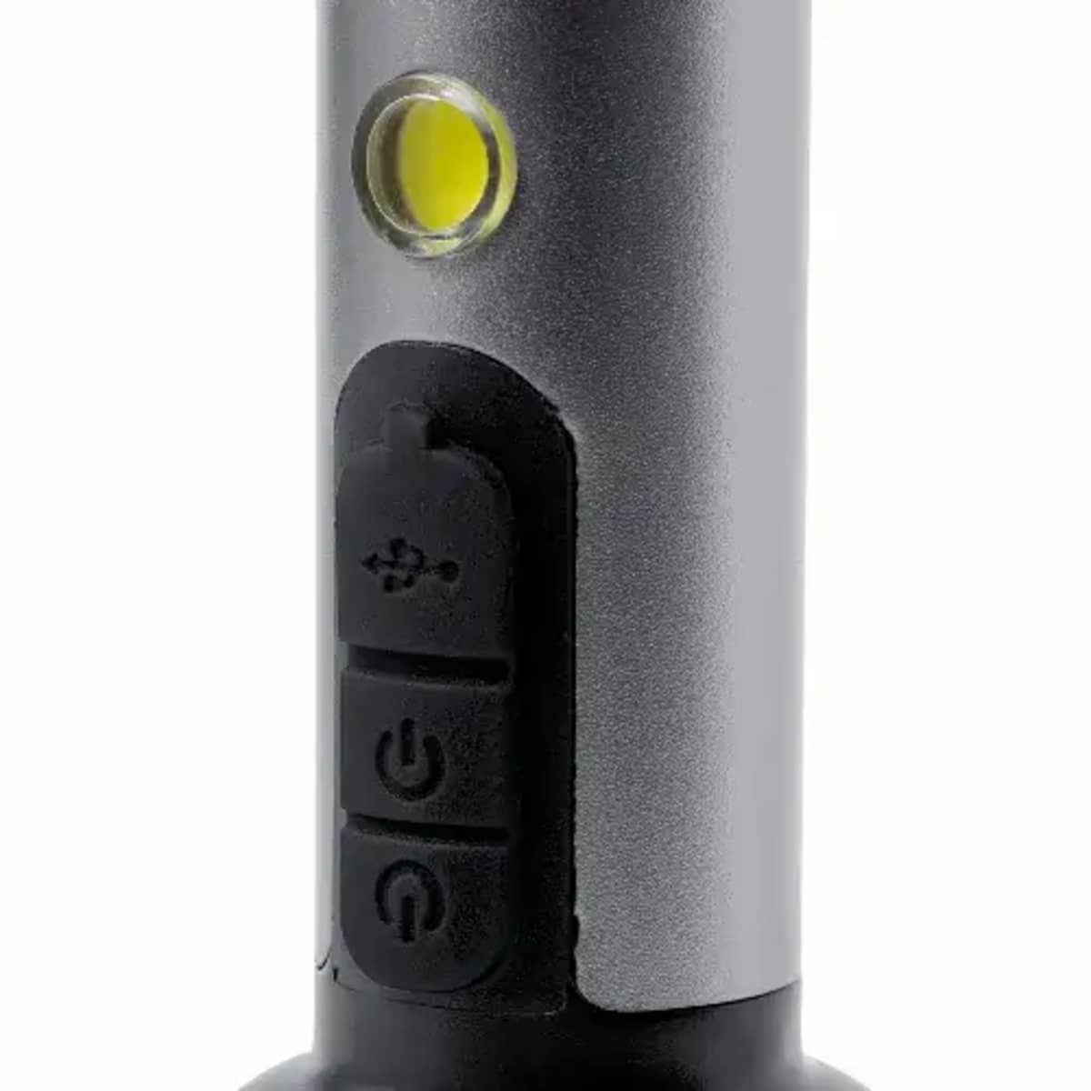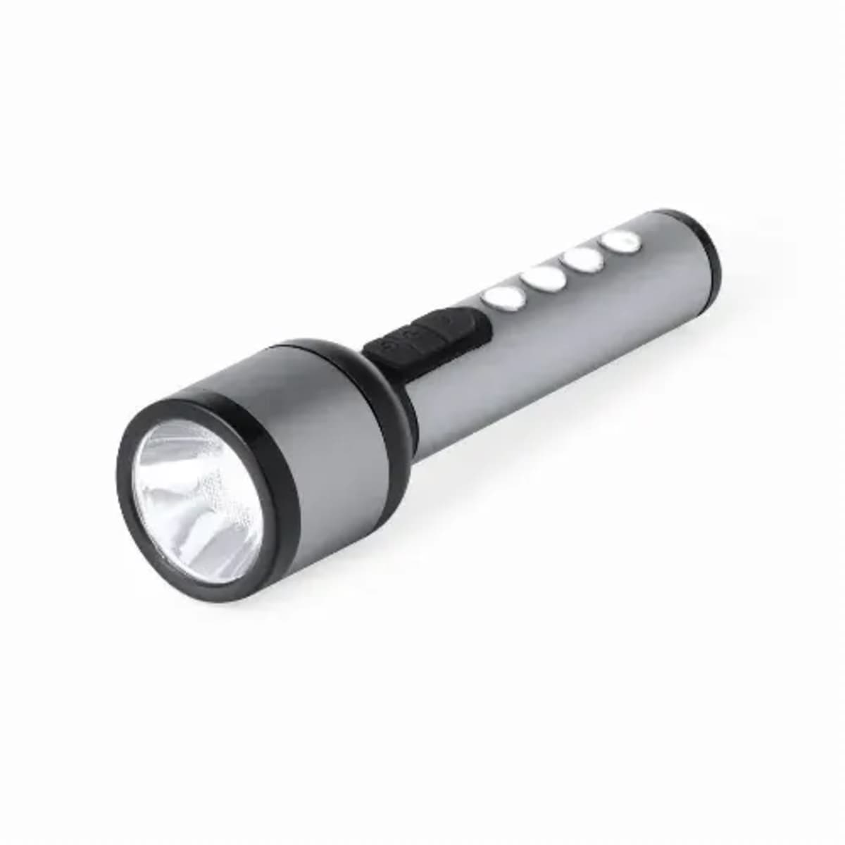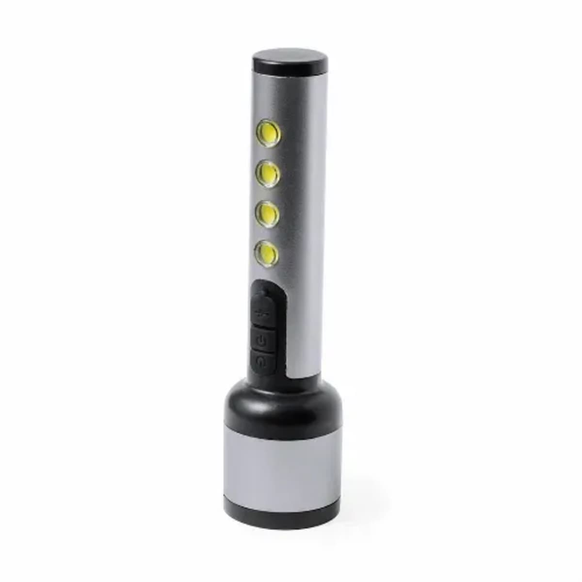 Powerful torch made of Aluminium with a classy design in a metallic grey finish with black accents.