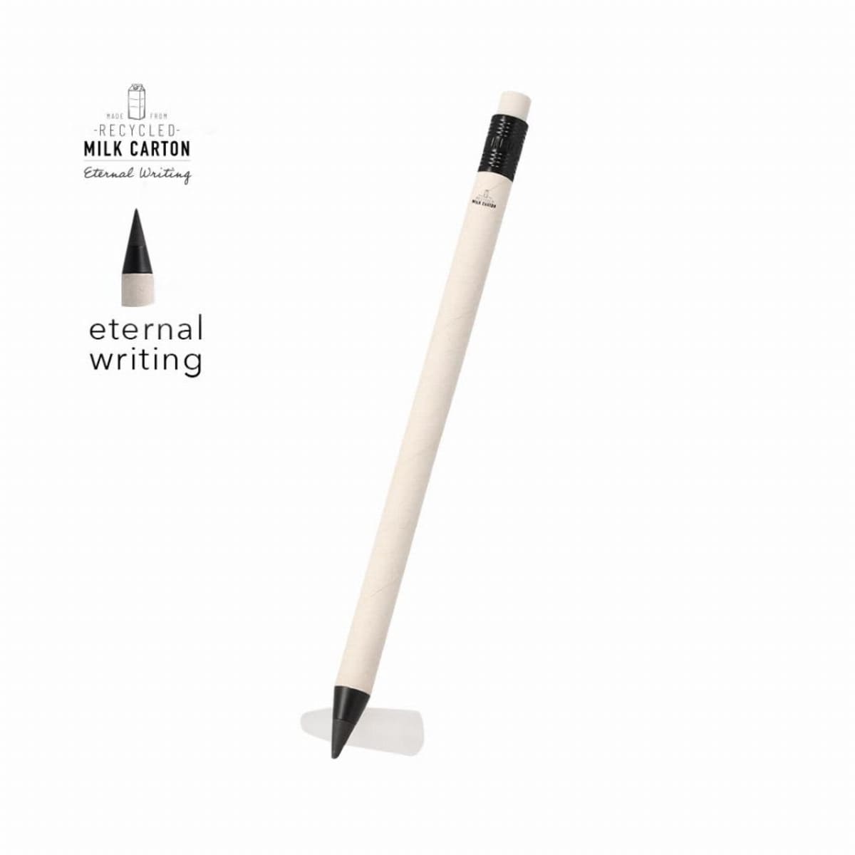 Features:  Reusable and with infinite writing. Including eraser at the top of the pencil. In white, with black details. With recycled milk carton logo on the barrel.Milk cartons are mostly made of cardboard and Aluminium. During the recycling process, the diffe