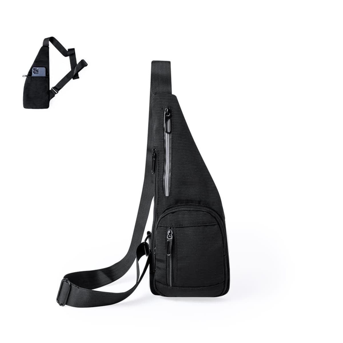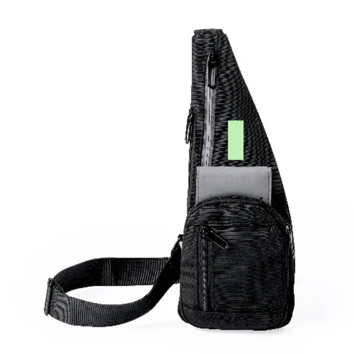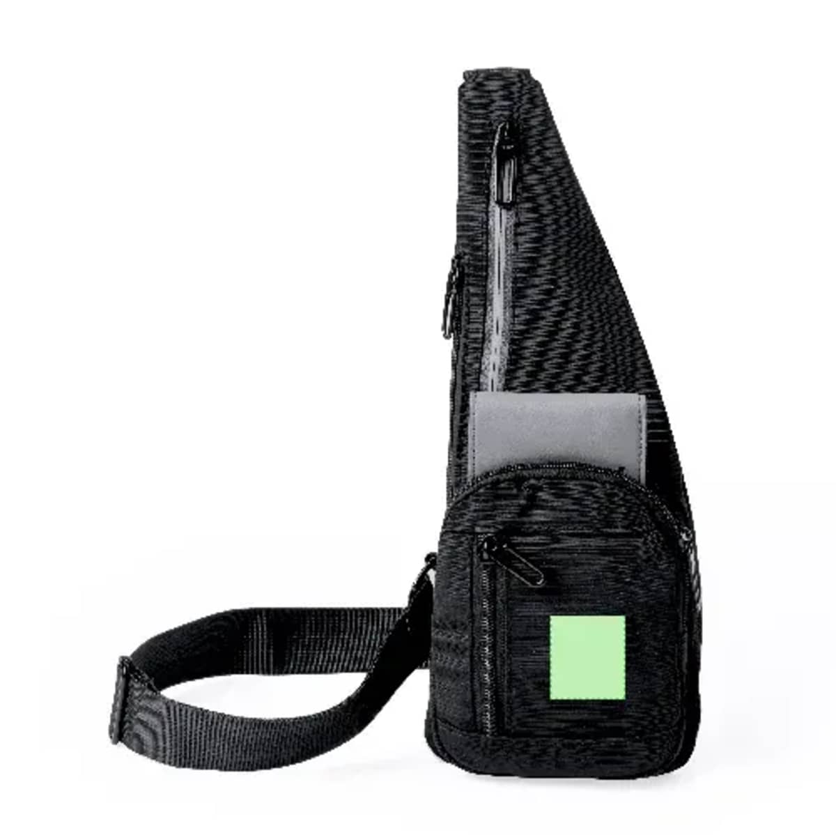 Two main pockets are located on the front and side, along with two additional pockets on the front and back. It is enhanced by a reflective strip on the central pocket for visibility. Presented individually in a recycled bag.
