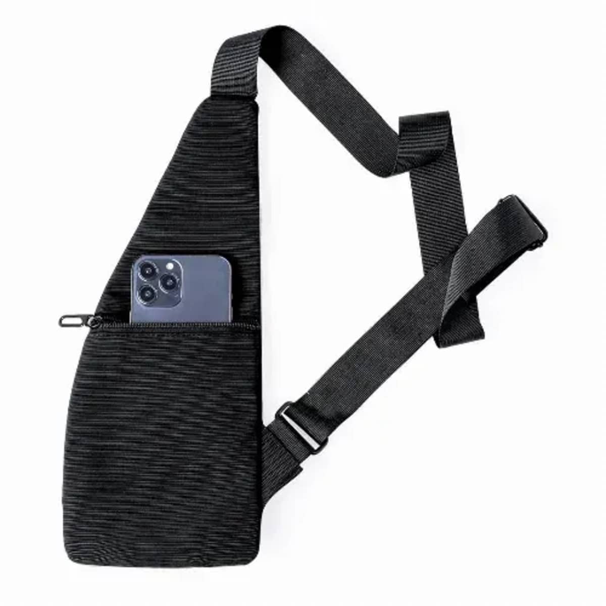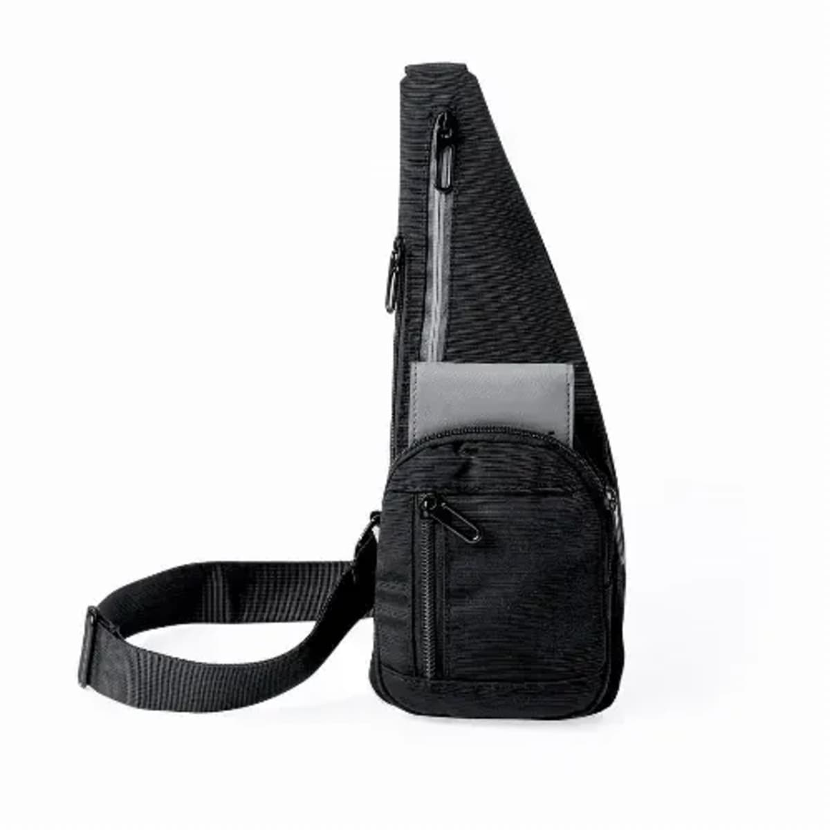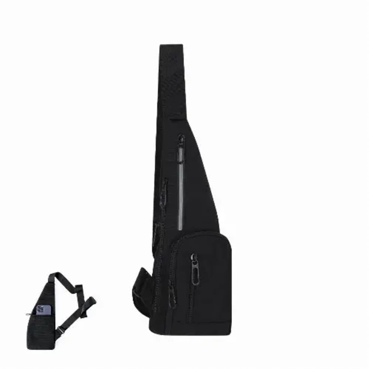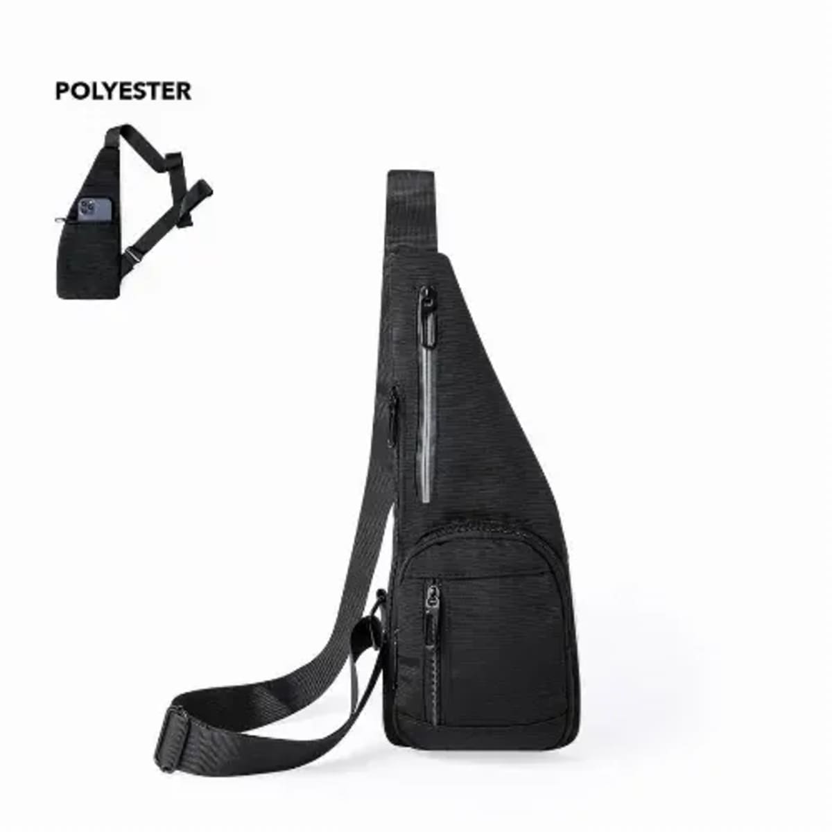 Two main pockets are located on the front and side, along with two additional pockets on the front and back. It is enhanced by a reflective strip on the central pocket for visibility. Presented individually in a recycled bag.