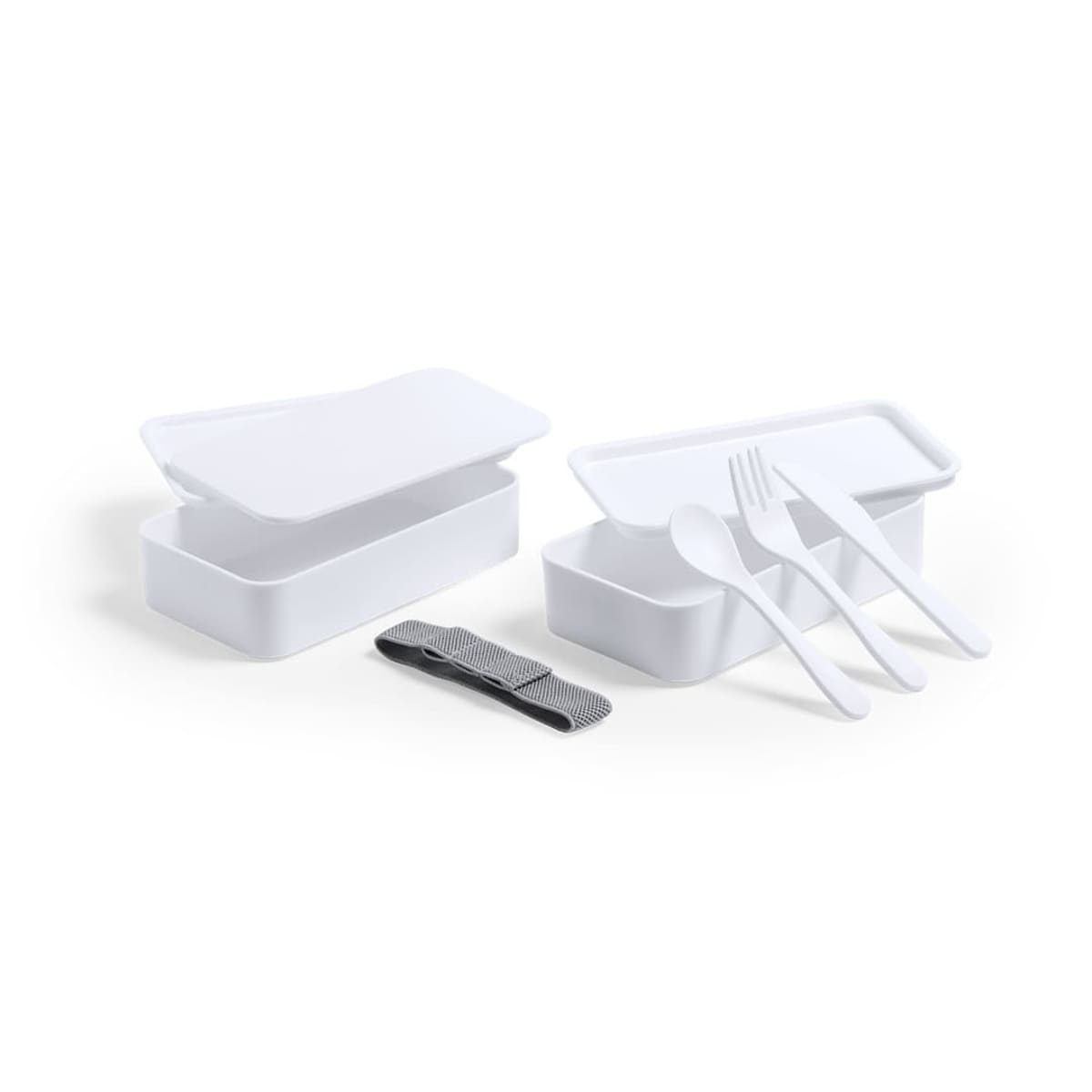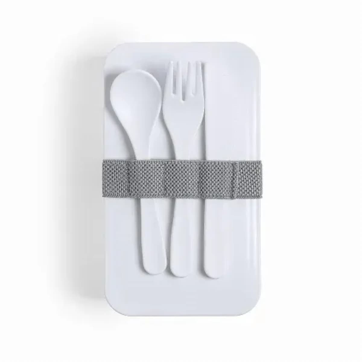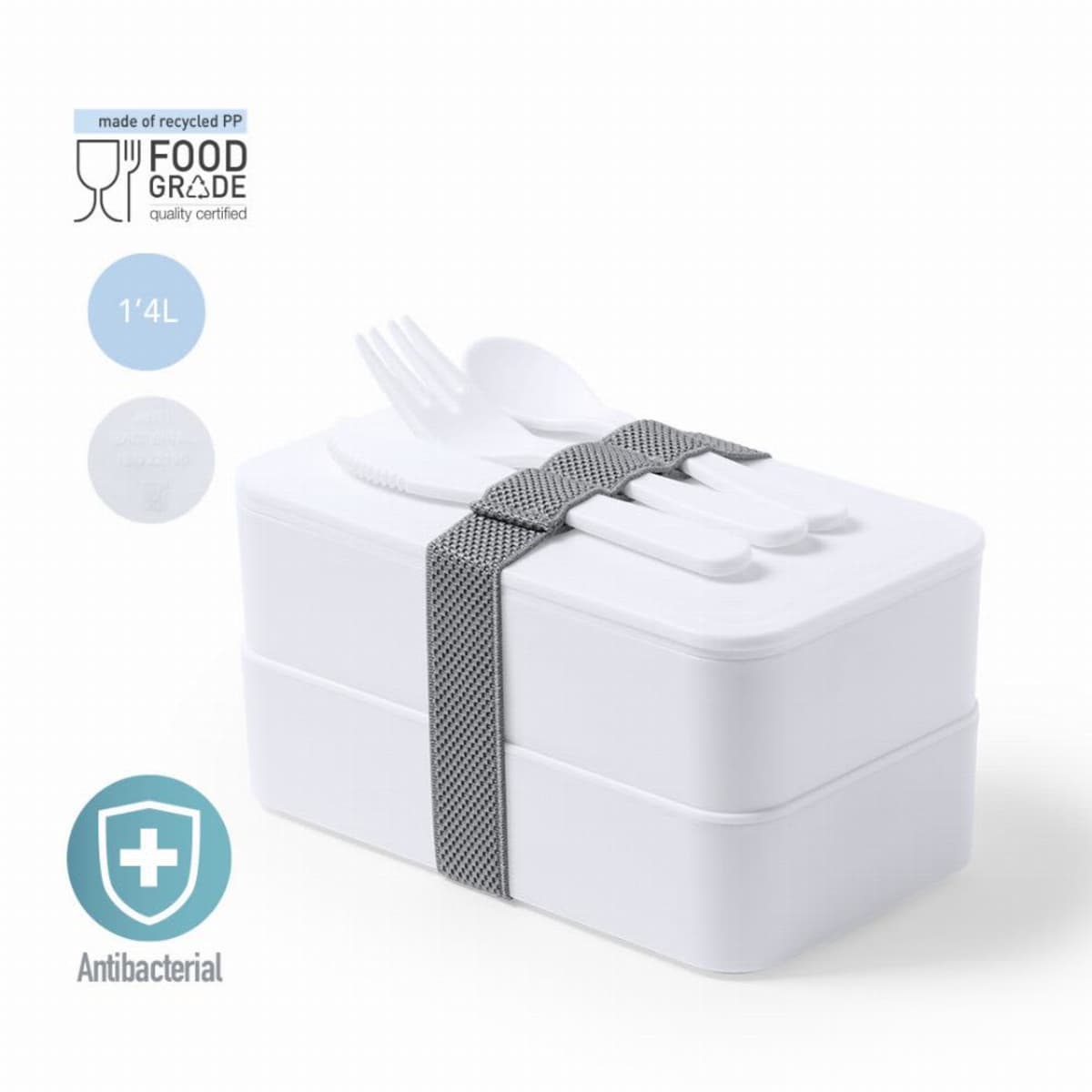 Features:  Two compartments, each with 700 ml capacity and safety belt with fork, spoon and knife. Products with antibacterial treatments are able to drastically reduce the bacterial levels present on the surfaces of the materials, thanks to the addition of