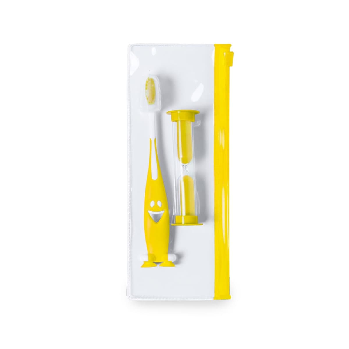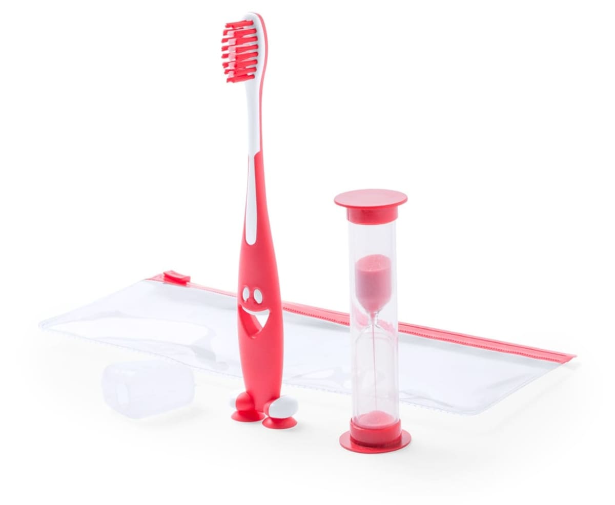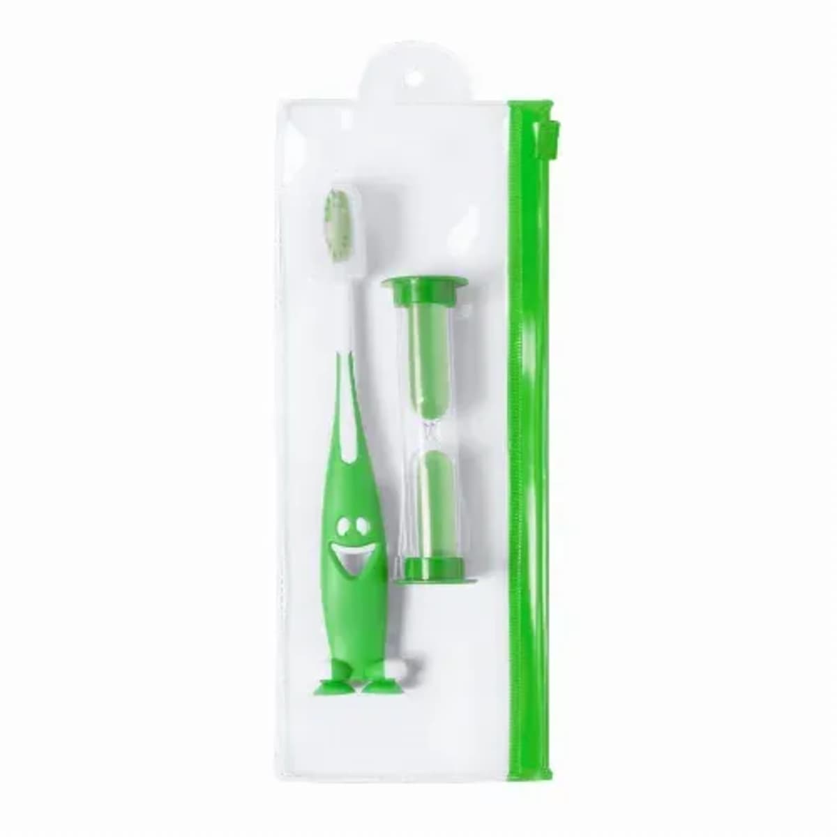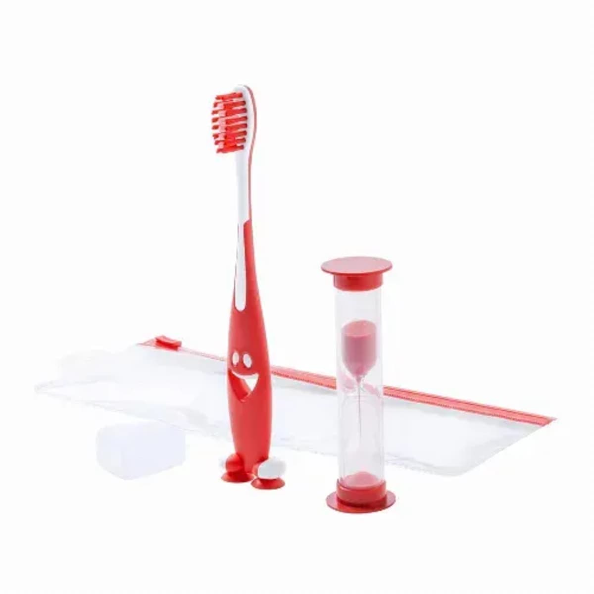 Features:  Includes fun design brush with soft touch and suction cups on the base, and 2 minute sand timer clock. Presented in an individual bag with zipper.