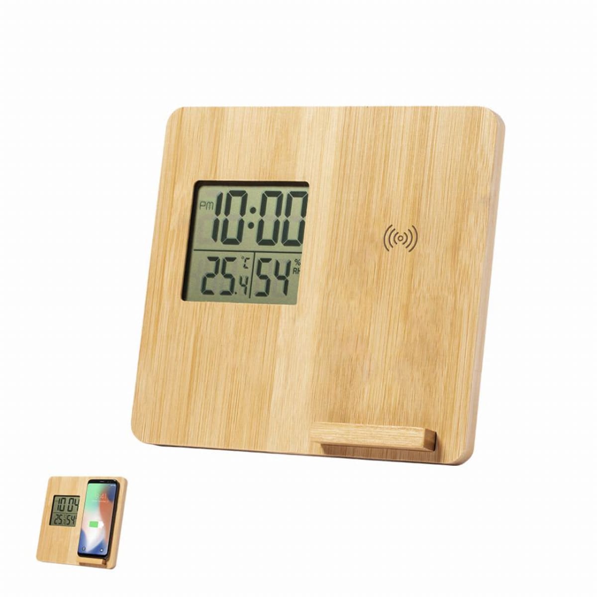 Made of polished bamboo, with thermometer and hygrometer functions. Including 1m Micro USB charging cable and compatible with devices equipped with wireless charging technology. Battery powered clock (cell button included) and presented in an attract