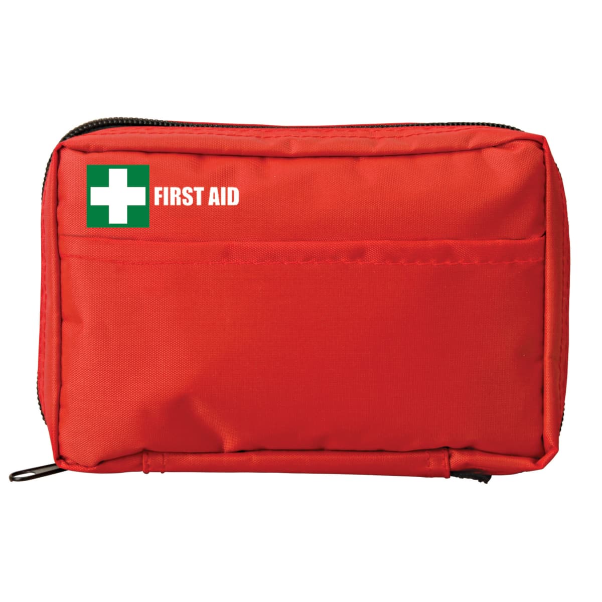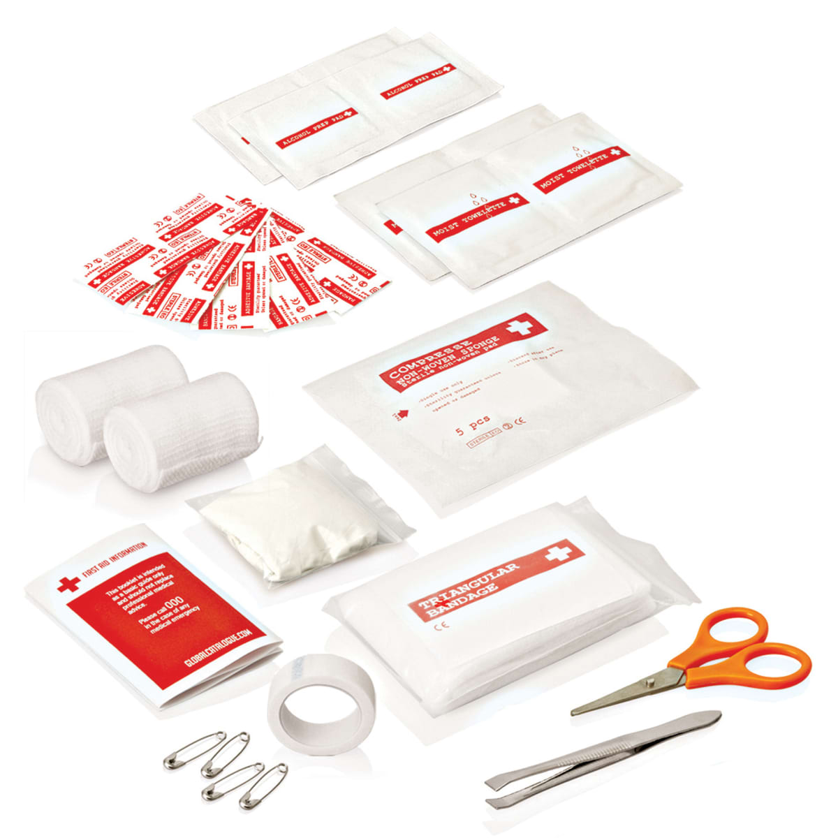 30pc First Aid Kit - Carry pouch with front pocket*Durable polyester pouch with compartments*5x small plasters*4x alcohol wipes*4x moist towelettes*2x PBT bandages*1x triangular bandage*5x non-woven pads*1x pair latex gloves*4x safety pins*1x scissor