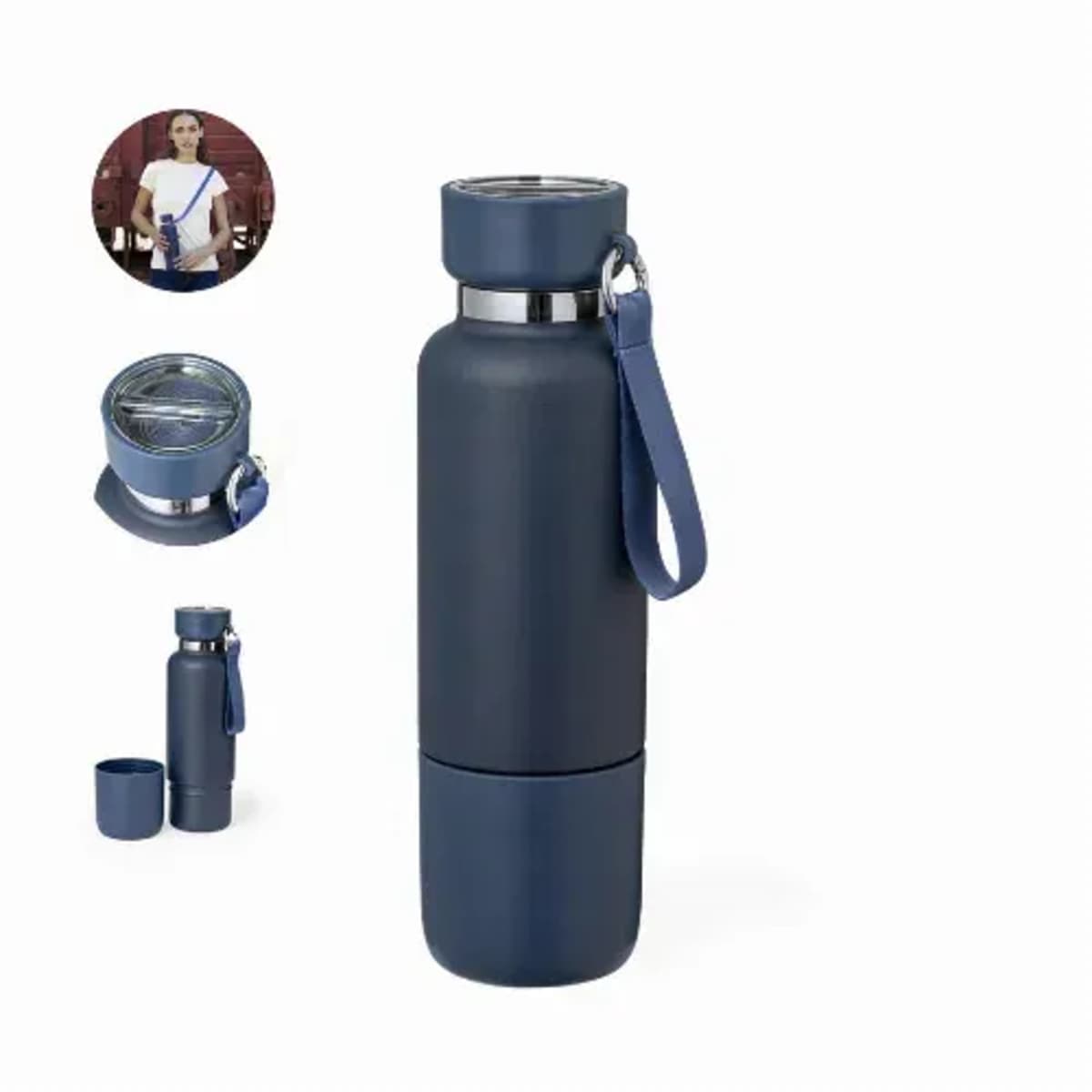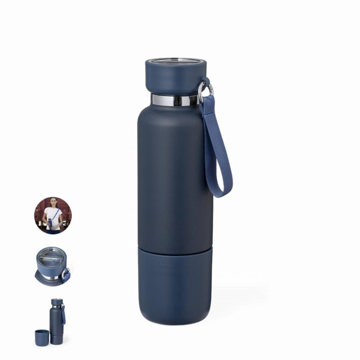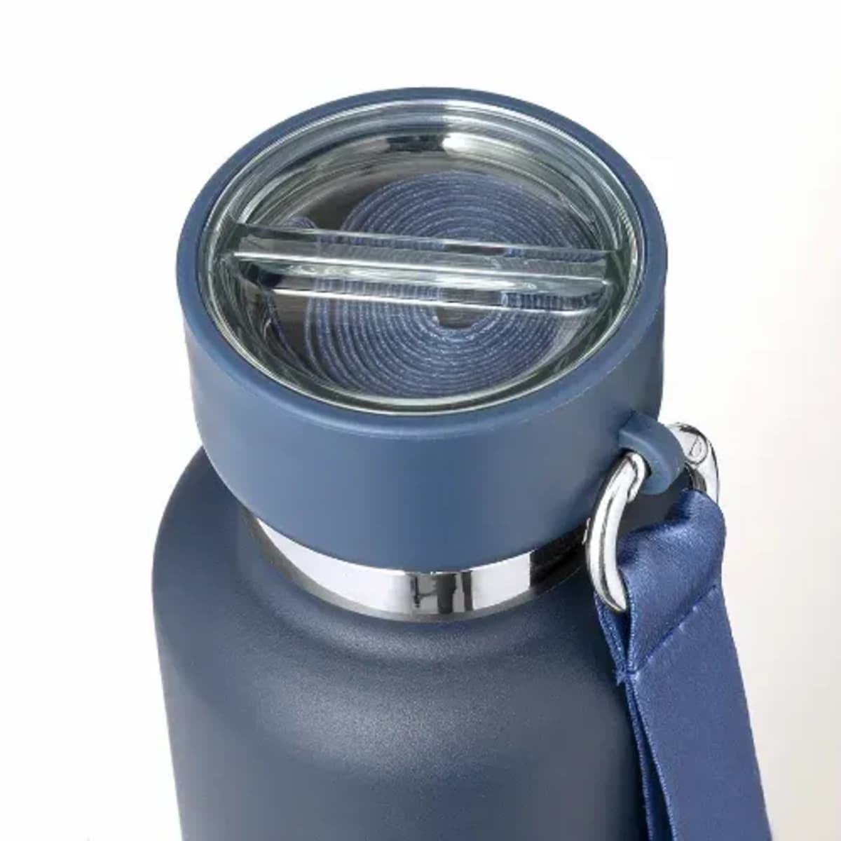 Its screw cap ensures a perfect seal, featuring a compartment with two interchangeable cords: an elegant bracelet and a versatile lanyard with carabiner hook for easy carrying. The base holds a 300 ml screw fitting tumbler in matching colour, made of