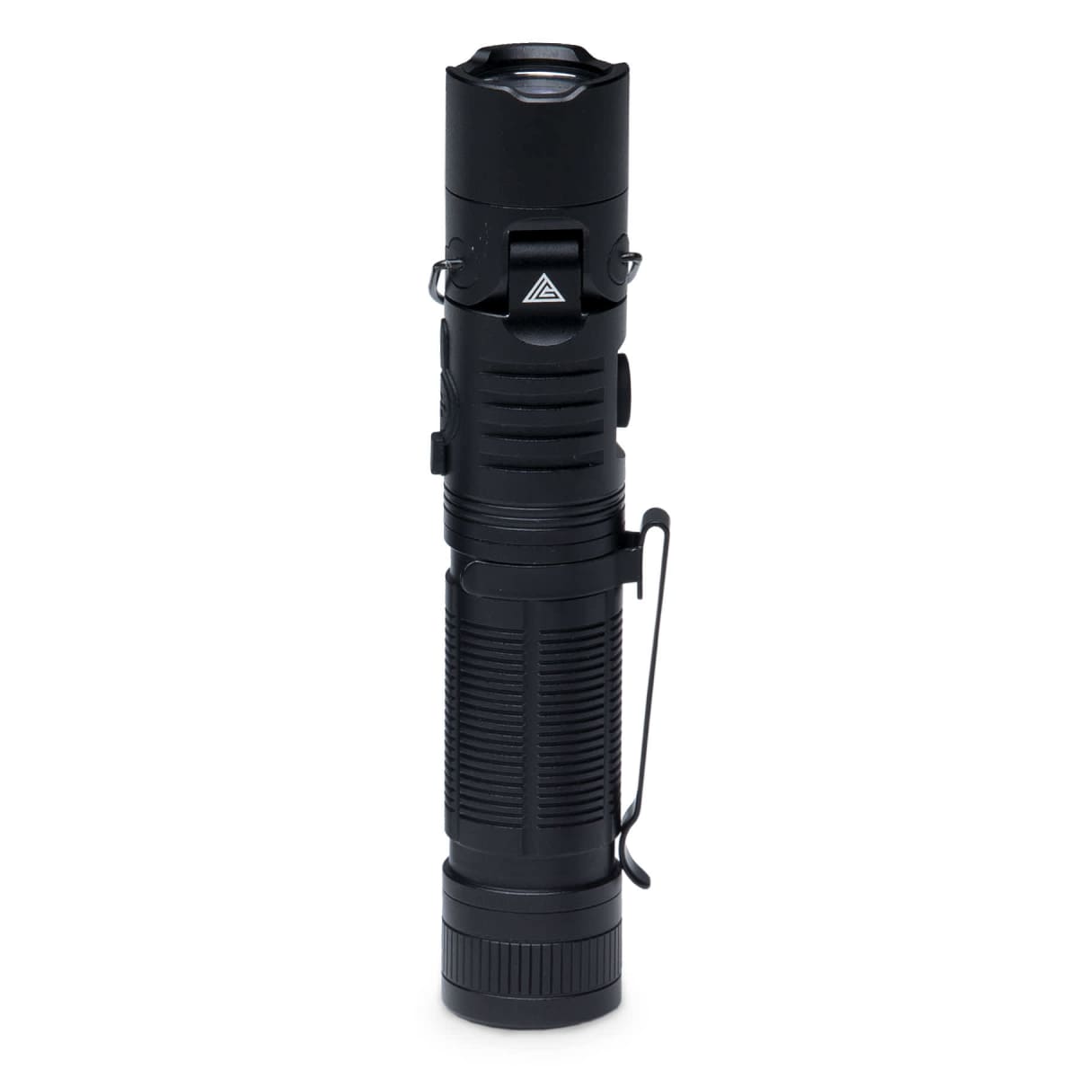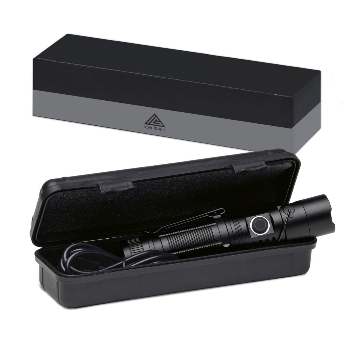 Multi functional Aluminium torch (13.7cm L x 2.5cm Dia.)|Plastic carry case with foam inlay|Bulb type: 10W SST40 LED white light|Output Lumens: 1000lm – High, Distance: 200m|Function button switches between 5 modes: High, Medium, Low, Strobe and SOS|Rechargeable 18650 battery: 2200mAh|Approx. 2-4 hours of run time, Approx. 2-4 hours of re-charge time|Green/red light battery power indicator|90 degree tiltable torch head|Anti impact torch head|Waterproof: IP44 rating|Magnetic base|Removable clip, Metal loop|Type-C charging cable included|Tactical Plastic carry case with foam inlay and 2 x quick lock closures|Engraved Ion Grit logo on torch|Supplied in an Ion Grit presentation box (18.5cm W x 4.55cm H x 5.5cm D) – check against sample