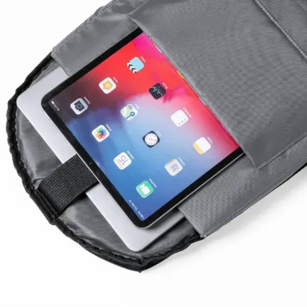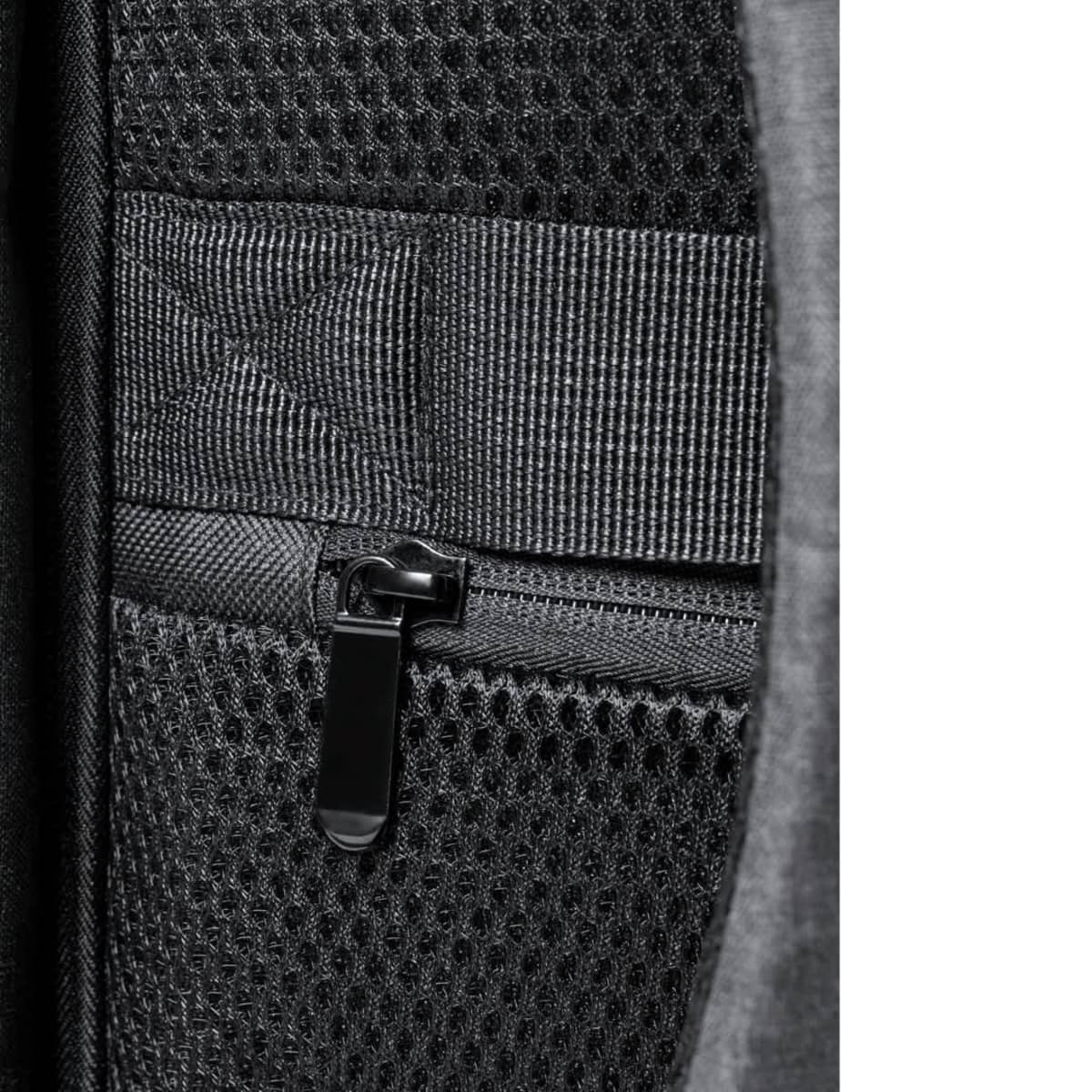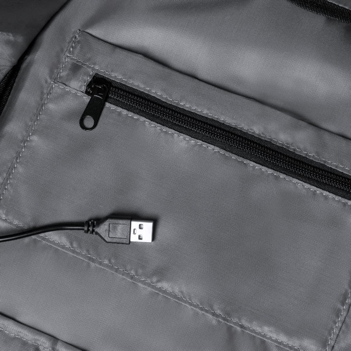 With anti-theft pocket on the back to store valuables. Inner compartment with USB port for powerbank connection (not included) and outside pocket with invisible zip. Padding on handle, back and shoulder straps, the latter adjustable. Inside with padd
