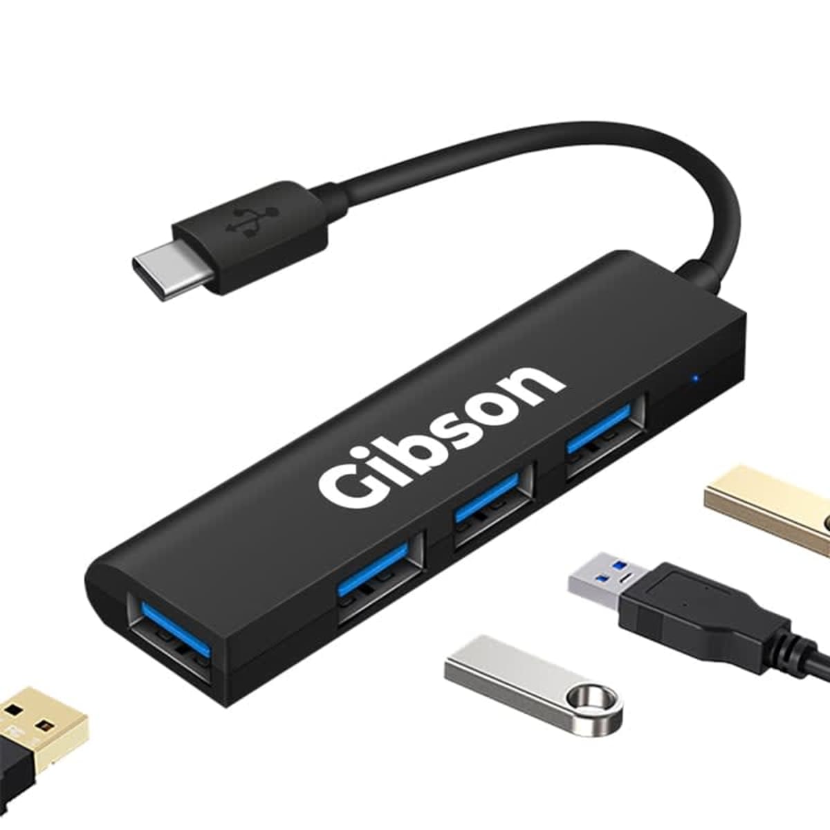 The Gibson is a slim, lightweight 4n1 hub designed to expand your laptop computer's connectivity. With a Type-C input, the Gibson provides four USB Type-A outputs, is hot-swappable, backwards compatible, and supports many data transfer devices and external input accessories. Material: ABS.