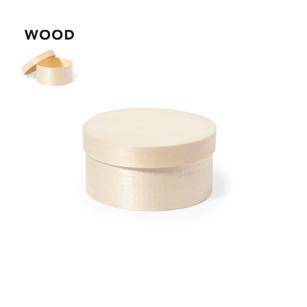 Presentation box in round format, made of natural wood with matching lid..