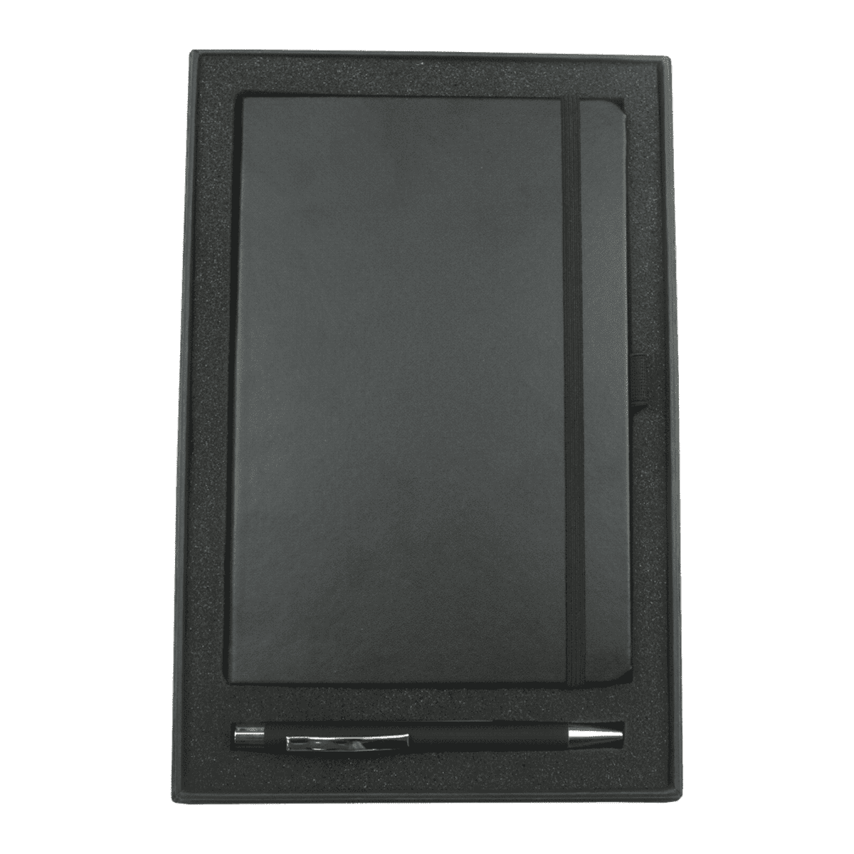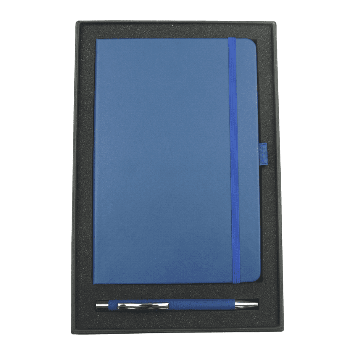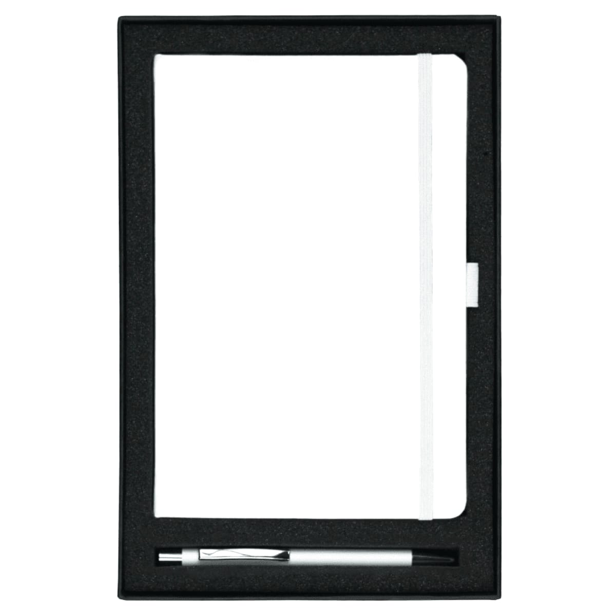Features a smooth, hard-cover A5 journal with built-in elastic closure and an aluminium pen in rubberised finish with shiny chrome accents.