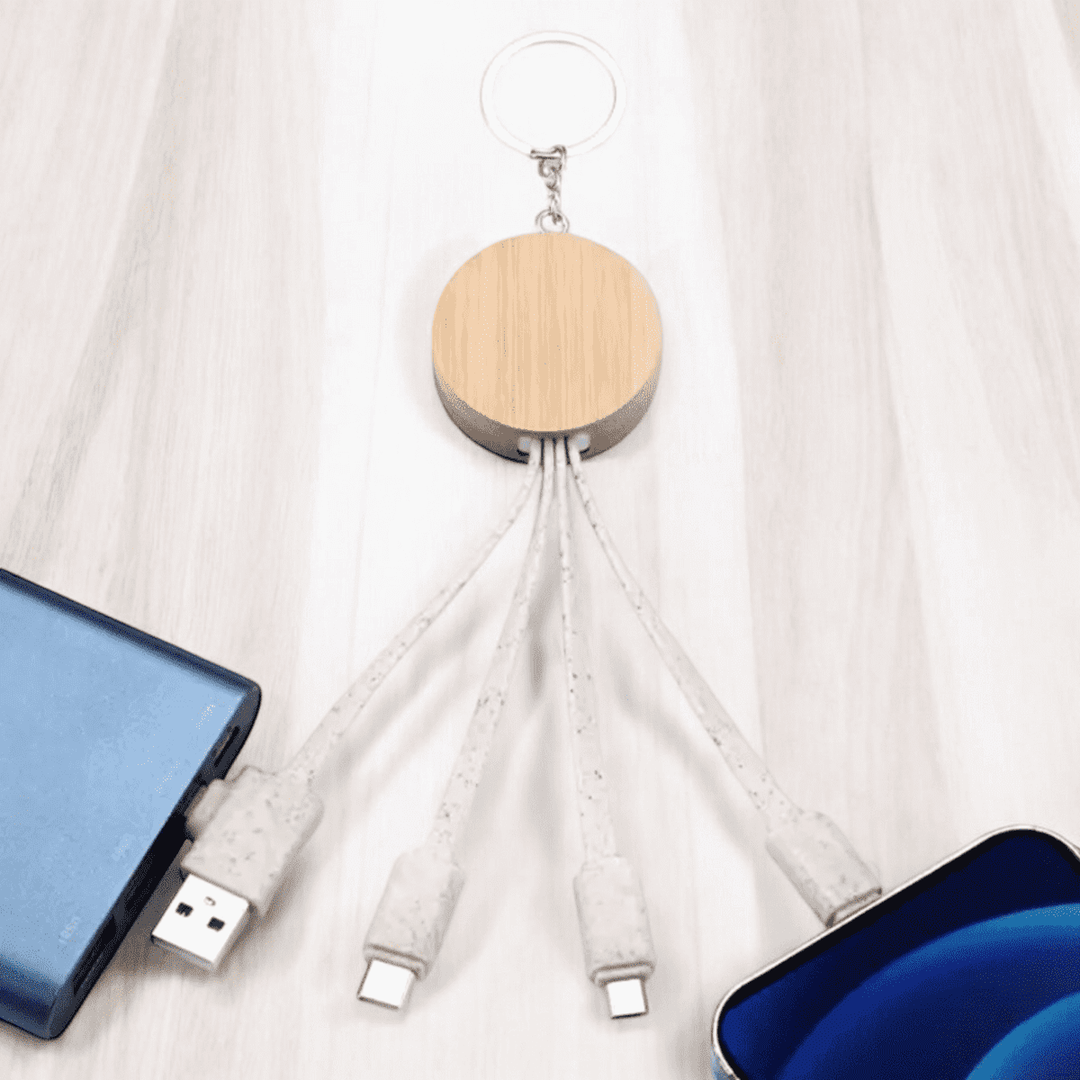 This versatile 4-in-1 USB cable is crafted from sustainable materials: bamboo for the holder and wheat straw for the cable, ensuring minimal environmental impact.