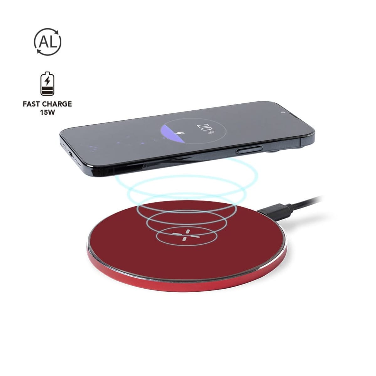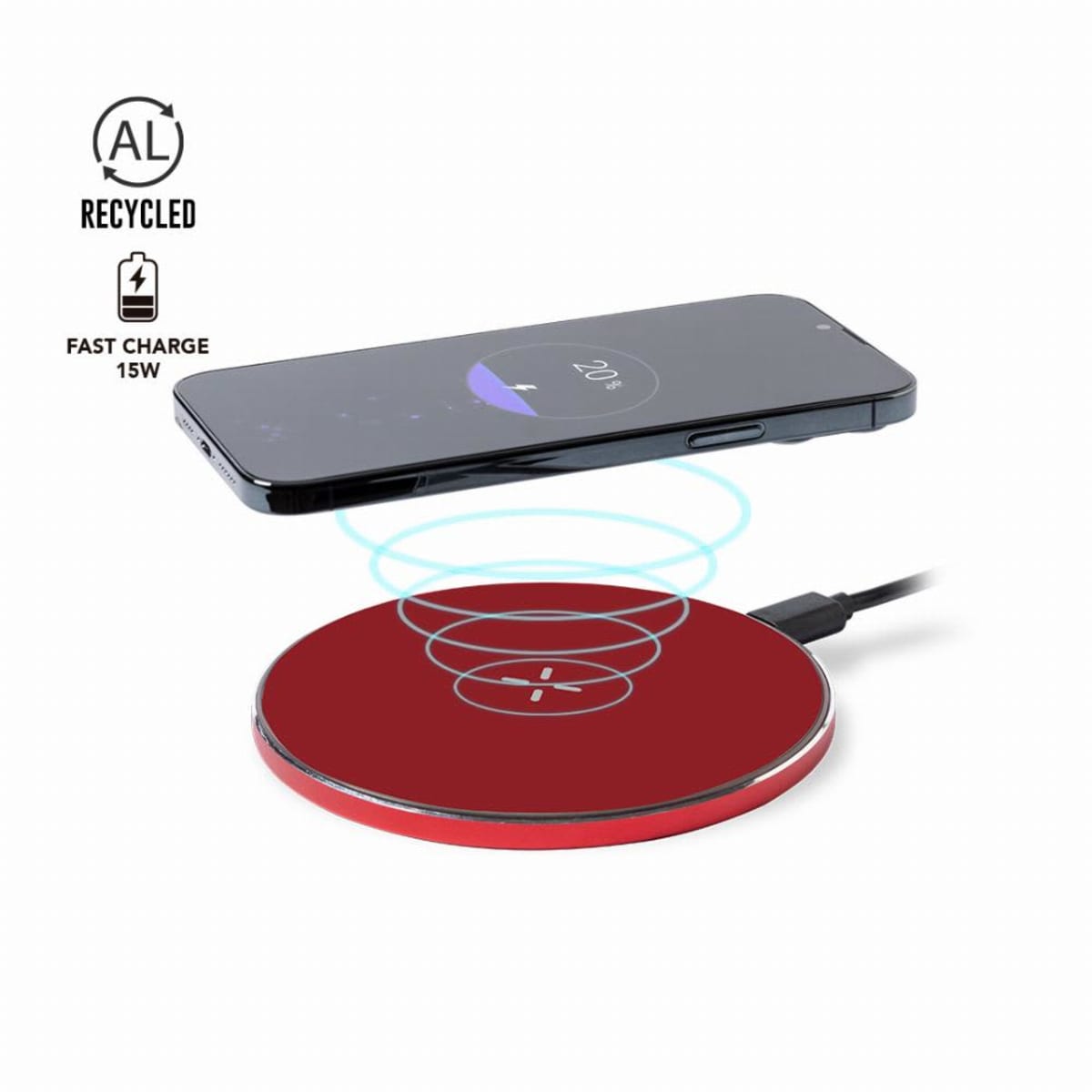 Made of recycled aluminium, a material with almost infinite recycling possibilities, keeping its original properties and consuming less energy in this process. Compatible with devices equipped with Qi wireless charging technology. Non-slip base, with
