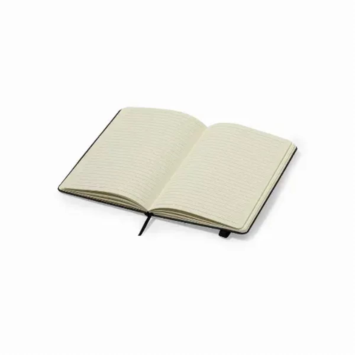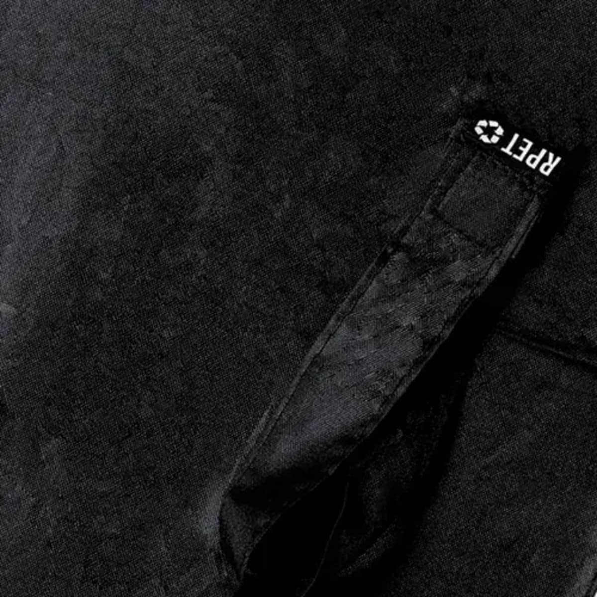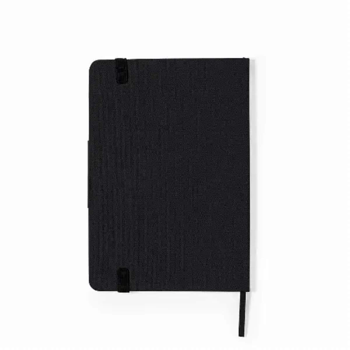 Matte silver metal handle, With stainless steel badge.RPET notepad in elegant black, with special metal detail for laser branding. Including elastic bands and fabric bookmark. Inside with 80 sheets, single-stripe layout. With RPET logo.98 cm diameter