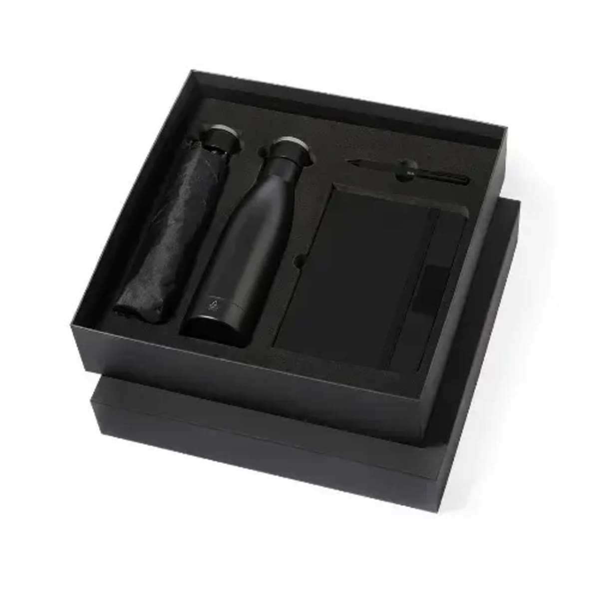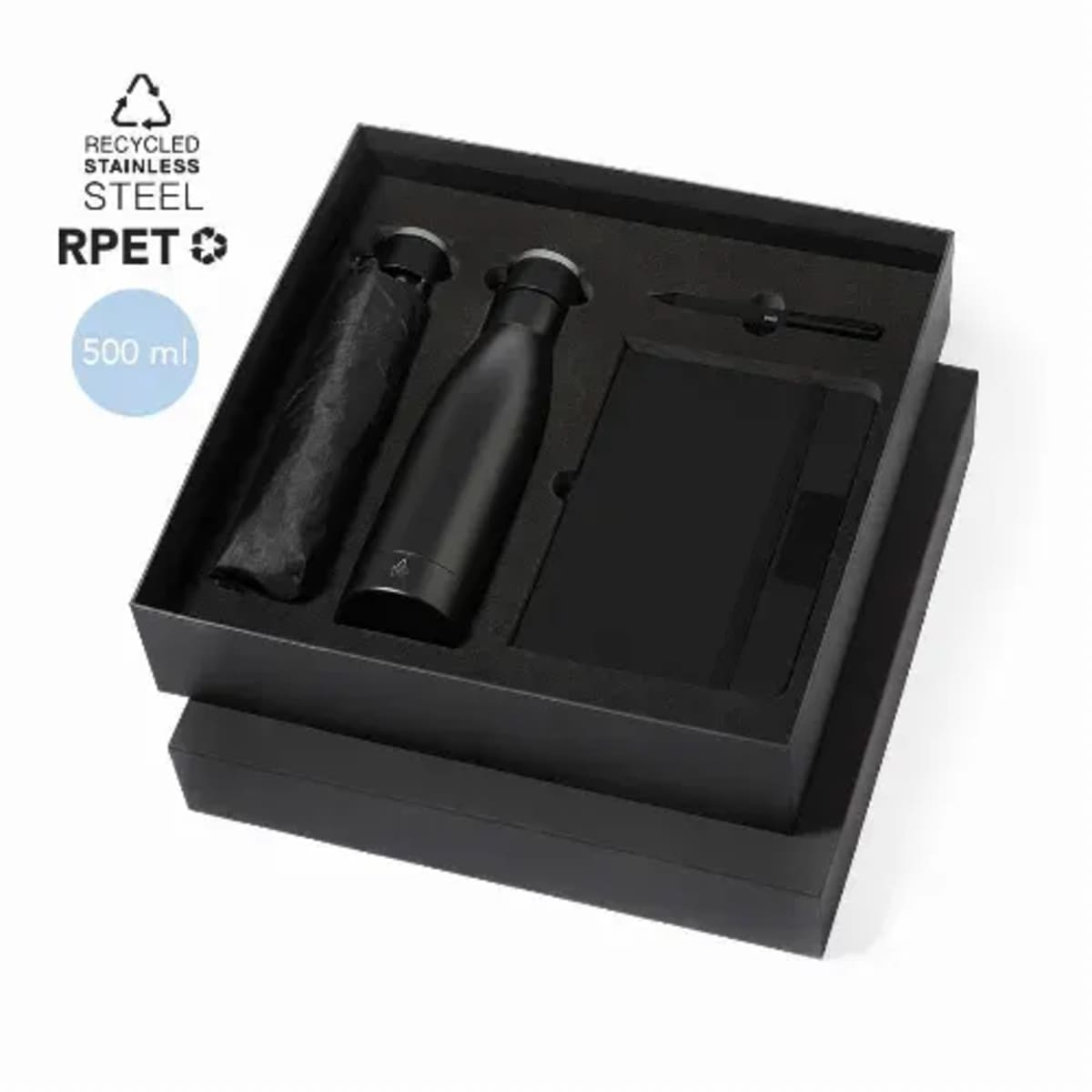 Stylish premium set including:Recycled stainless steel double-layer thermos bottle with matte black finish and 500ml capacity.